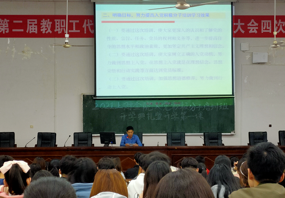 (本网讯)4月6日晚,财政金融学院2021年上半年入党积极分子培训班开班典礼暨第一次党课在二教2J01教室举行。学院党总支副书记何桂基及202名入党积极分子参加开班仪式暨党课培训。 活动现场何桂基在动员讲话中强...