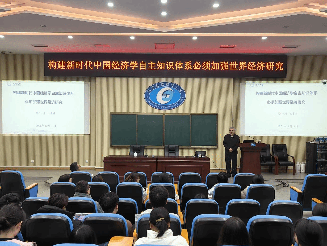 12月19日下午,一场以“构建新时代中国经济学自主知识体系必须加强世界经济研究”为主题的学术讲座在beat365中文在线官网2J02教室开讲。厦门大学经济学院庄宗明教授应邀主讲,为师生们带来经济学领域的深度分享。本次讲座由财政金融学院院长刘辉煌主持,党委书记肖燕飞全程参加。讲座现场 贺慧真 吴睿/摄讲座伊始,庄宗明教授以王亚南的学术探索为切入点,为听众展开了一幅中国经济学从萌芽到迈向新时代自主知识体系构建的宏大画卷。1938年,...