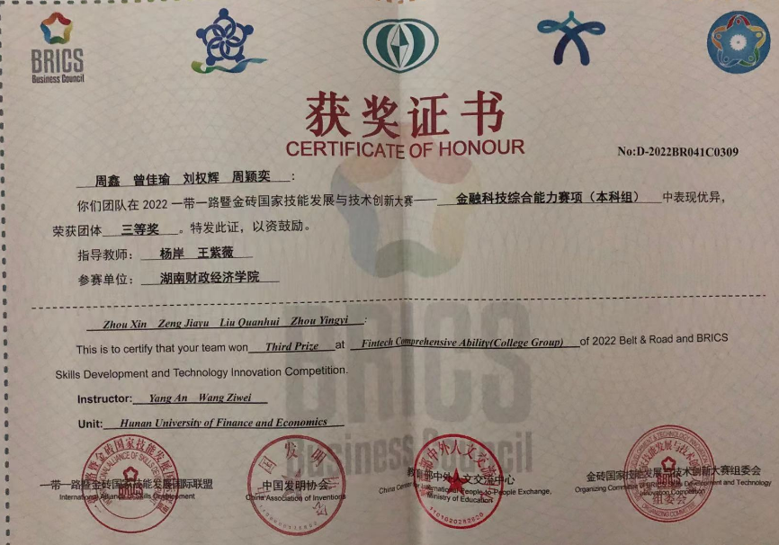 (本网讯)近日,2022一带一路暨金砖国家技能发展与技术创新大赛之金融科技综合能力赛项全国总决赛圆满结束,beat365官网金融科技专业学生周鑫、曾佳瑜、刘权辉、周颖奕在杨岸、王紫薇两位老师的指导下荣获全国三等奖。获奖证...