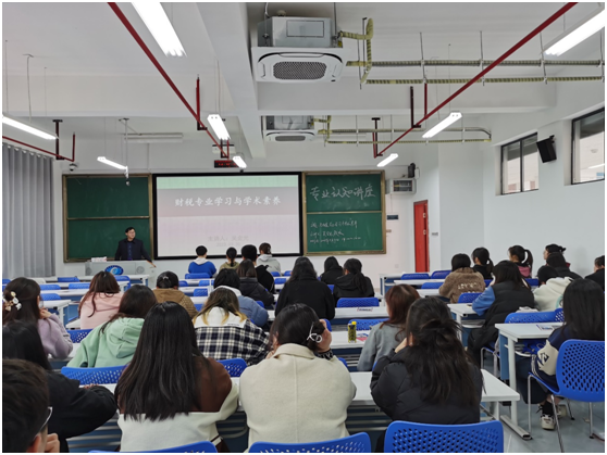 (本网讯)4月13日下午,财政金融学院税收学系主任胡小梅为2022级财政学类专业全体学生作财税专业创新创业能力培养的专题讲座。讲座由税收学系专任教师胡扬主持,共计100多名学生参加讲座。胡小梅基于《大学生创新创...