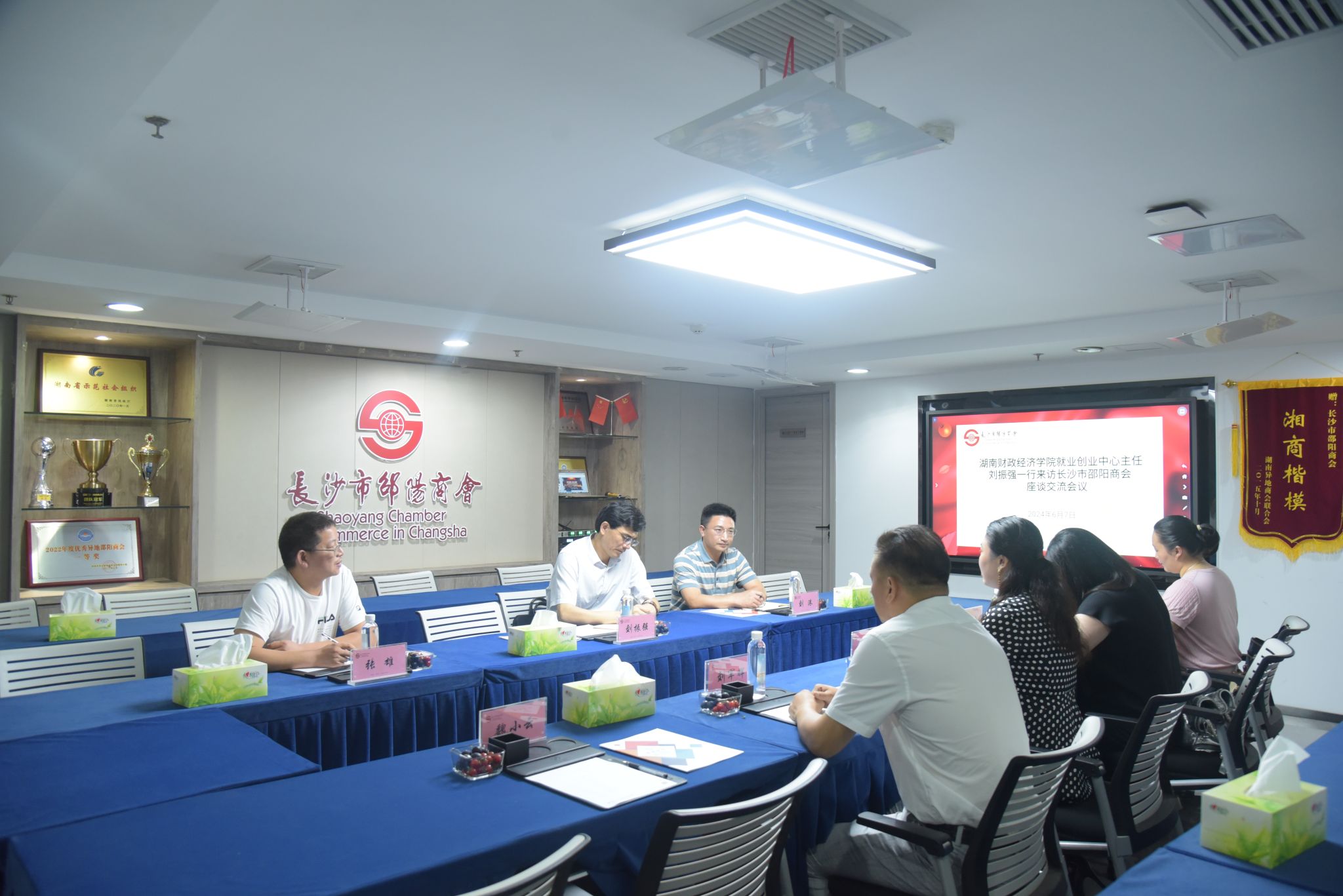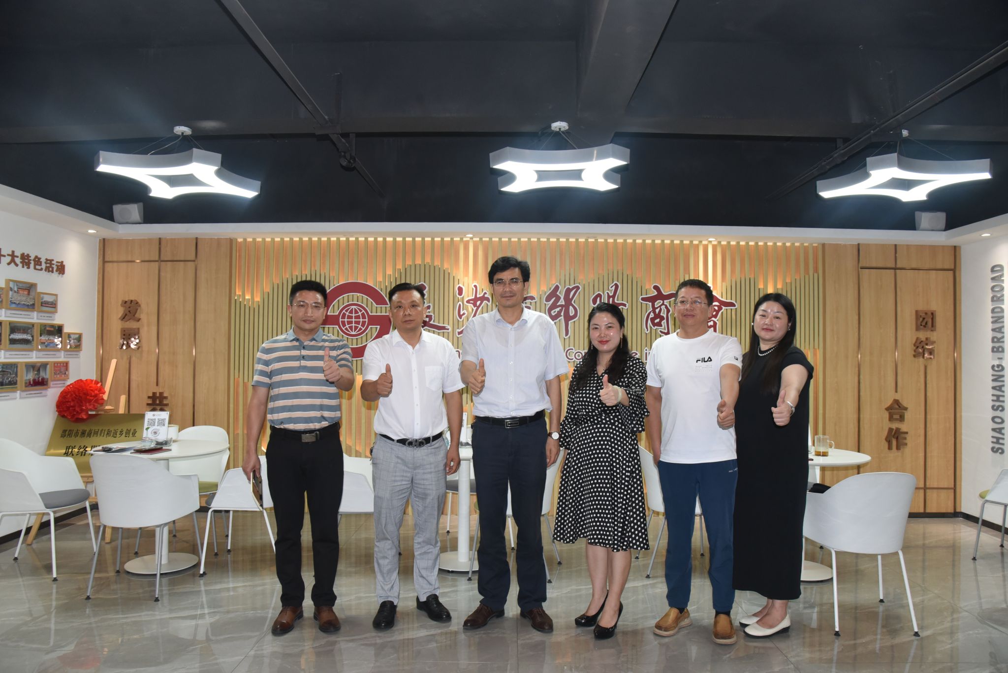 (本网讯)6月7日下午,就业创业中心(校友联络中心)主任刘振强、副主任刘港、创新创业教育部主任张雄一行调研走访长沙市邵阳商会,调研组在长沙市邵阳商会执行秘书长徐巧平、副会长刘军辉、湖南锦程职业培训学校副校长吴婷玉等陪同下,参观商会办公场地、文化墙、党建活动室及荣誉墙,了解商会17年来的建会历程及办会特色。