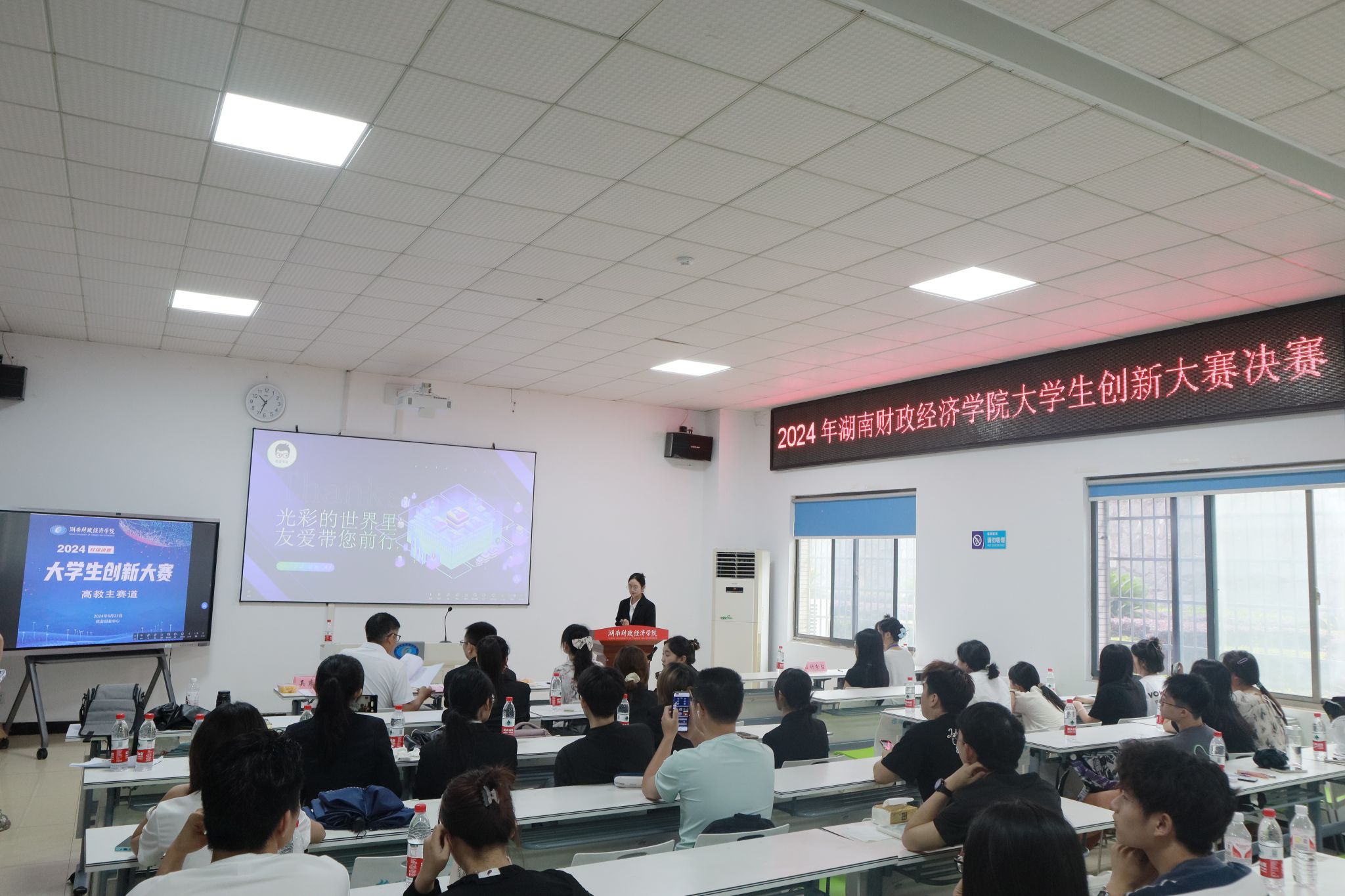 本次校赛现场路演赛共有29支参赛队伍角逐一等奖和二等奖。按照抽签顺序分高教主赛道、“青年红色筑梦之旅”赛道两个赛场进行5分钟的路演和3分钟的答辩。在路演环节,参赛团队详细介绍了项目的市场痛点、科技创新点、商业模式、竞品分析等内容,并通过视频、图片等多种形式展示了项目的实际运作效果。在答辩环节,评委老师针对项目的可行性、创新性以及潜在风险等方面进行了深入提问,参赛队伍凭借扎实的专业知识和敏捷的思维给出了精彩的回答。