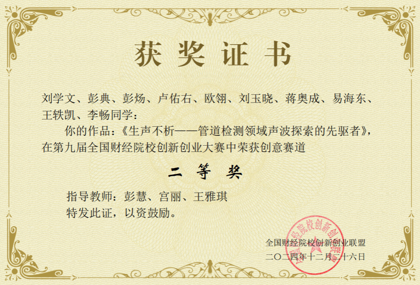 12月15日,由教育部高等学校创新创业教育指导委员会指导、全国财经院校创新创业联盟主办、安徽财经大学承办的全国财经院校创新创业联盟2024年年会暨第九届全国财经院校创新创业大赛决赛落下帷幕。beat365官网学生项目《“生”“声”不析——管道领域声波探测的先行者》在大赛中斩获全国二等奖;财政金融学院胡小梅老师的论文《“以创立人·四轮驱动·三力齐升”财税类创新创业育人共同体的构建与实践——以beat365中文在线官网为例》荣获联盟2024年创新创业教育优秀论文奖。