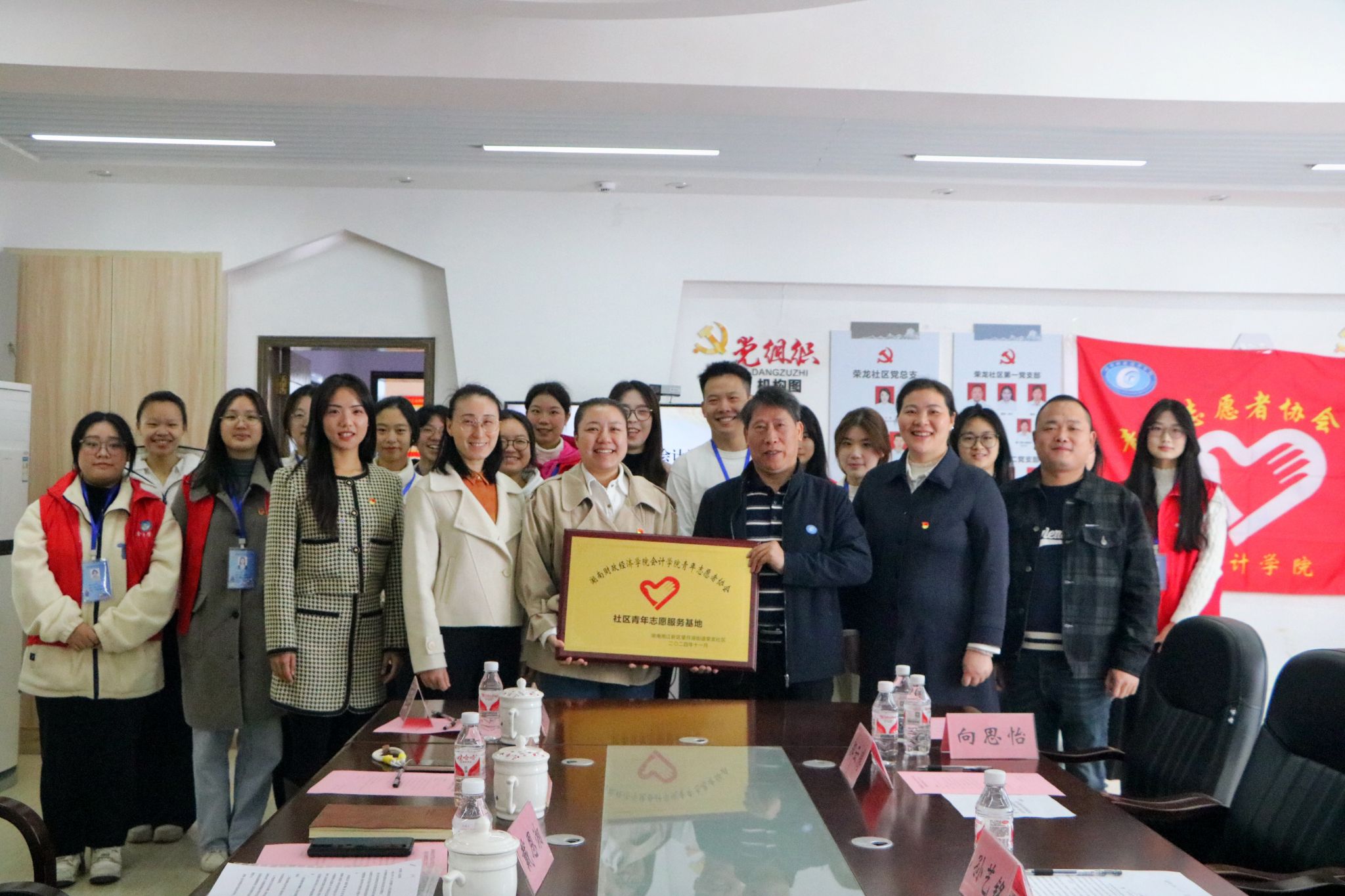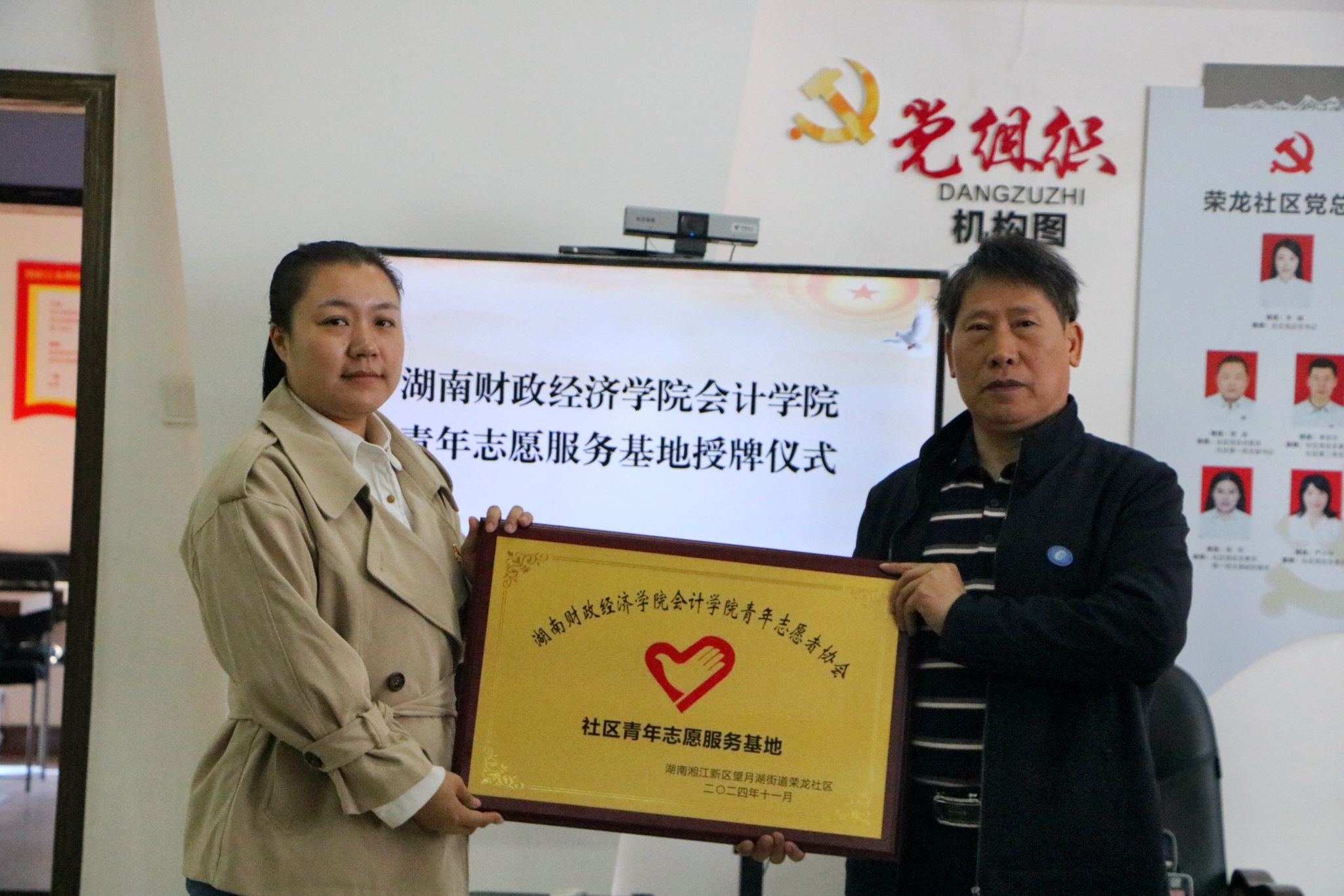 (本网讯)为大力弘扬“奉献、友爱、互助、进步”的志愿者精神,进一步推动会计学院青年志愿服务事业发展,传播会计学院“青志同心,会爱同行”的志愿文化,2024年11月29日,beat365中文在线官网会计学院青年志愿者协会与望月湖街道荣龙社区共同举办了社区青年志愿服务基地授牌仪式。望月湖街道人大工委主任刘娜、会计学院党委书记戴恩湘、党委副书记肖芳、团总支书记管超男、院青协18名学生干部参加,会议由荣龙社区党总支书记李融主持。