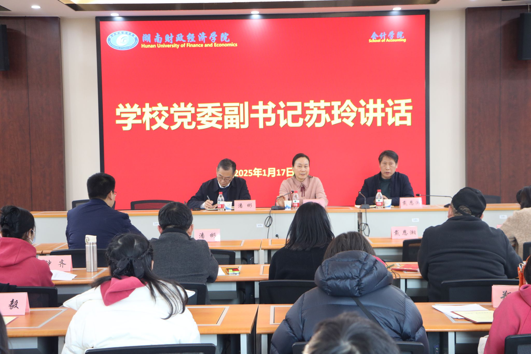 (本网讯)1月17日下午,会计学院于实验楼1403召开教职工大会暨2024年年终总结大会。会议由院党委书记戴恩湘主持,学院全体教职工参加,学校党委副书记苏玲莅临指导。