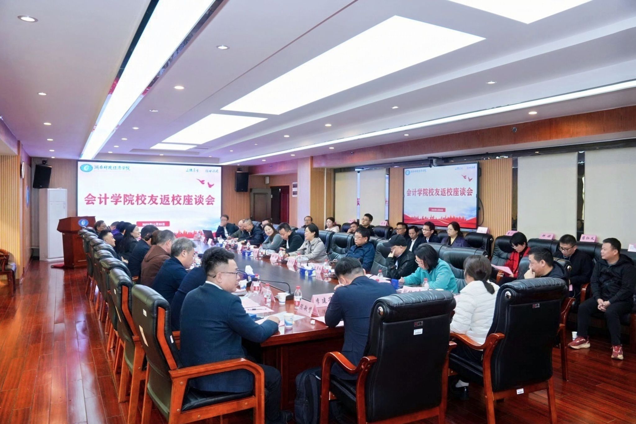 (本网讯)11月23日,会计学院校友分会年度总结大会暨校友座谈会于办公楼715会议室顺利举行。校党委委员、副校长兼会计学院院长潘爱民、创新创业与人工智能学院直属党支部书记兼校友总会会长余华、会计学院党委书记戴恩湘和35名校友代表欢聚一堂,共话师生情。会议由会计学院党委副书记肖芳主持。