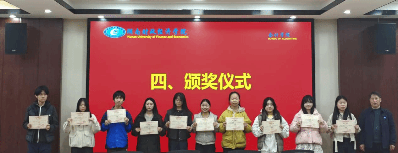 活动在主持人曾峻的开场致辞中拉开帷幕。杨晓辉在讲话中回顾竞赛的创办背景与组织历程,他指出本次比赛积极响应了数字经济时代对会计人才能力结构的新要求。然后,肖芳宣读获奖名单,各位院领导上台为40组获奖参赛队伍及17名优秀指导老师颁奖。