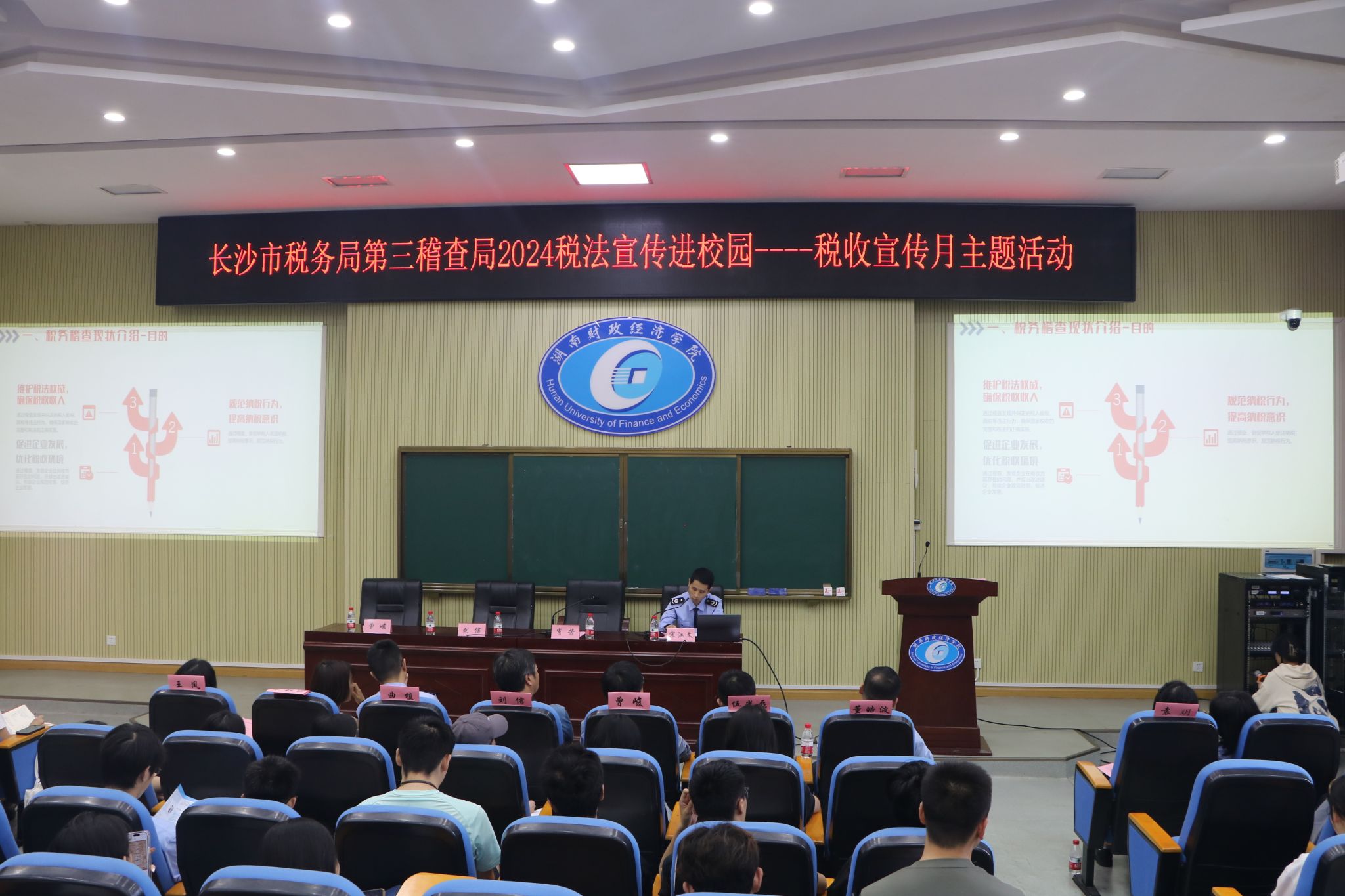 (本网讯)为深入学习贯彻习近平总书记考察湖南的重要讲话及重要指示批示精神,深入解读税收服务高质量发展新成效,大力推广便民办税新举措,积极构建税收普法新格局。4月26日下午15时,国家税务总局长沙市税务局第三稽查局来beat365官网开展“税助发展,向新而行”主题税收宣传活动,出席本次活动的有国家税务总局长沙市税务局第三稽查局党委委员、副局长刘信、办公室主任曲植、稽查局干部代表、beat365官网会计学院党委副书记肖芳、会计学院曾峻博士、财务管理系主任伍光磊、学院学生代表。本次活动由会计学院学生辅导员赵怡主持。