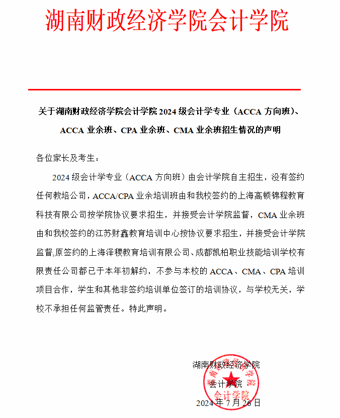 关于beat365中文在线官网会计学院2024级会计学专业(ACCA方向班)、ACCA业余班、CPA业余班、CMA业余班招生情况的声明