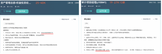 会计师事务所、投资银行、商业银行、咨询公司、国企、政府机关、500强企业等在招聘财会人员时,大多会明确要求候选人拥有CPA证书。由此,也被称为求职"敲门砖”。有了注册会计师证书,在择业和晋升方面都会有很大的优势。CPA持证人从事的高薪职位包括:首席财务官(CFO)、财务总监、财务经理、审计项目经理、财税咨询师、企业风险管理师等。