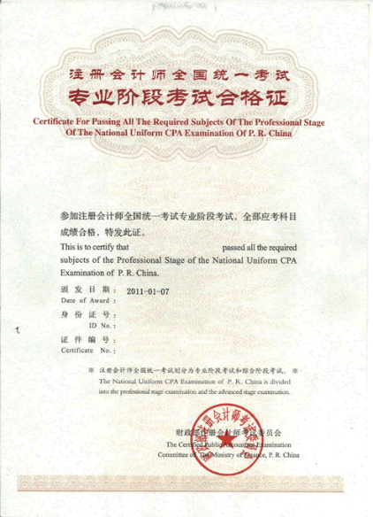 专业阶段设立考试科目:《会计》、《审计》、《财务成本管理》、《经济法》、《税法》、《战略与风险管理》。综合阶段设立考试科目为职业能力综合测试。连续5个年度考试中取得专业阶段考试全部科目合格成绩的考生,颁发注册会计师全国统一考试专业阶段考试合格证。取得该专业阶段考试合格证后可报考综合阶段考试。对取得综合阶段考试科目合格成绩的考生,颁发注册会计师全国统一考试全科合格证。