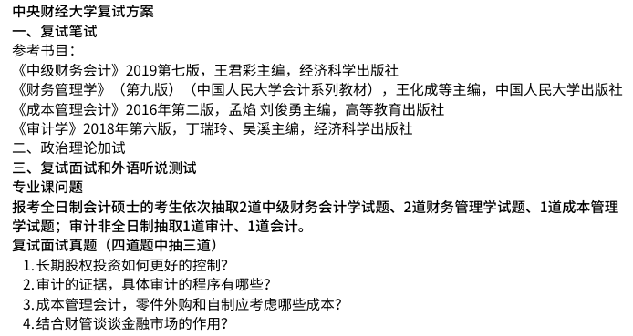 在财会方向考研MPAcc的复试环节中,国内众多双一流高校复试题目为CPA备考内容,以中央财经大学为例,近年来央财复试题目涉及会计学、财务管理学、审计学。