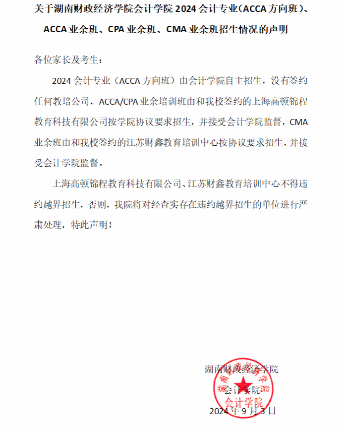 关于beat365中文在线官网会计学院2024会计专业(ACCA方向班)、ACCA业余班、CPA业余班、CMA业余班招生情况的声明