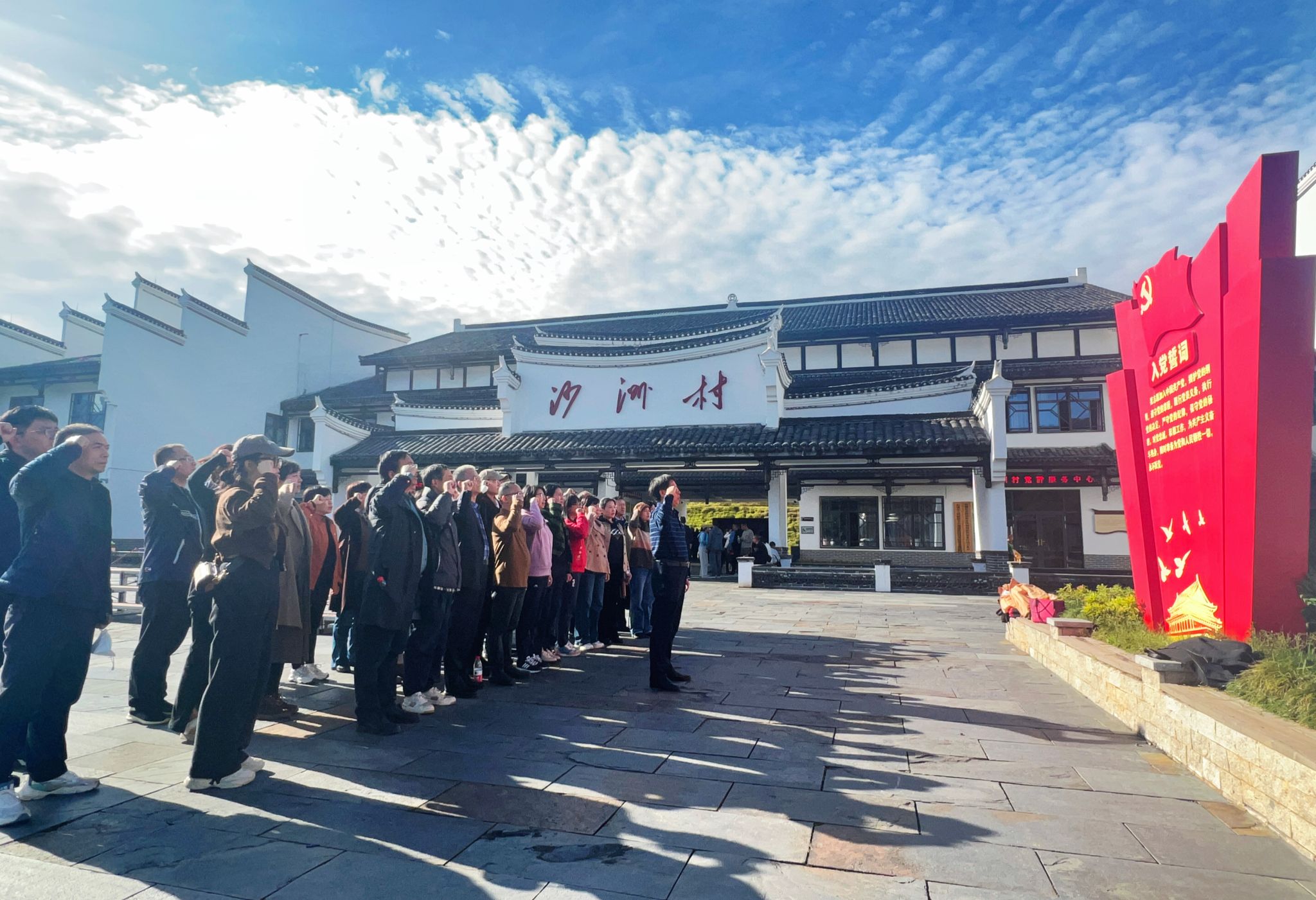 戴恩湘带领党员在沙洲村前重温入党誓词