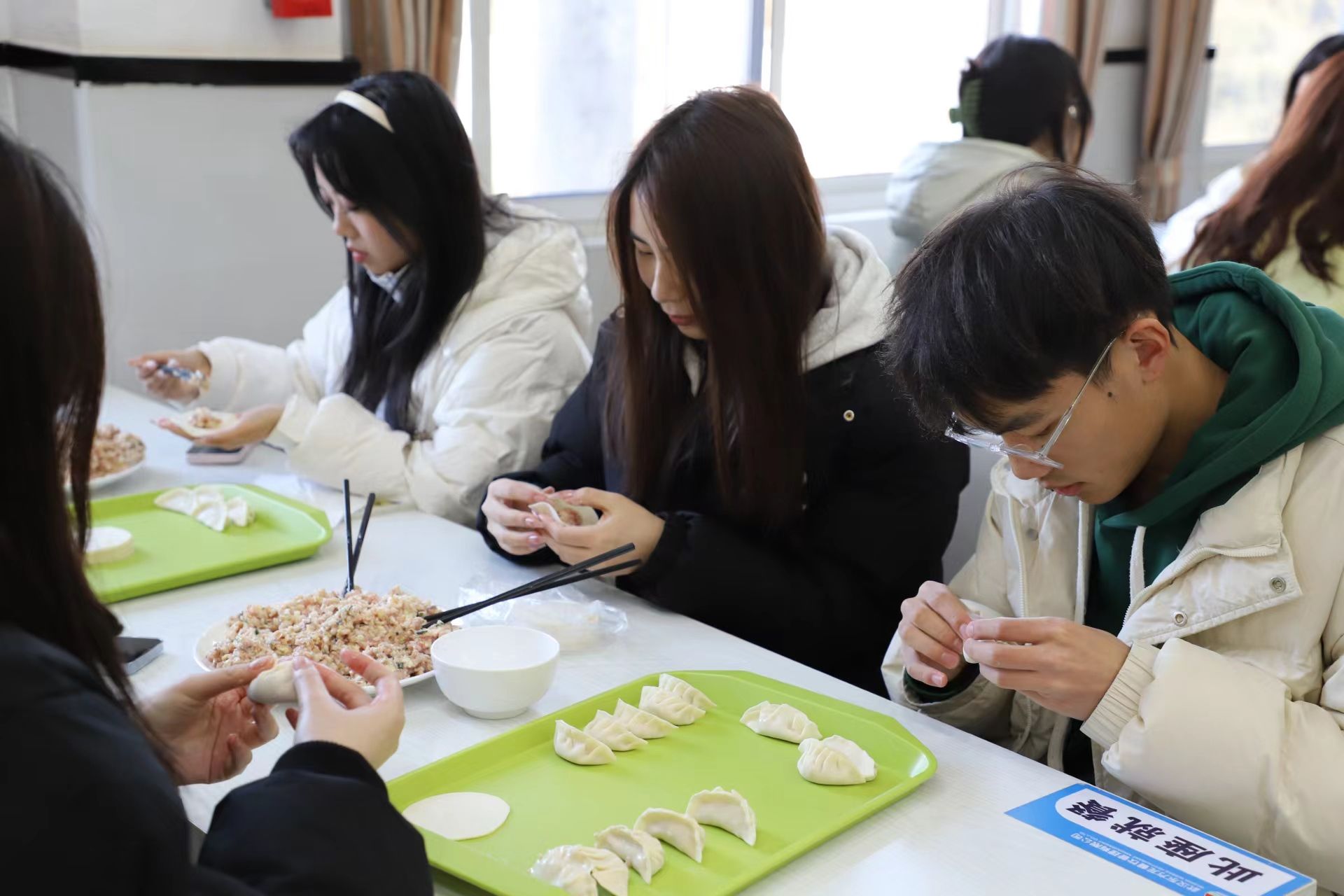 接下来,学生们在老师的指导下,亲自动手包起了饺子。包饺子的过程中,欢声笑语不断,师生们互相交流,共同探讨包饺子的技巧,增进了师生之间的情感交流,也锻炼了学生们的动手能力。