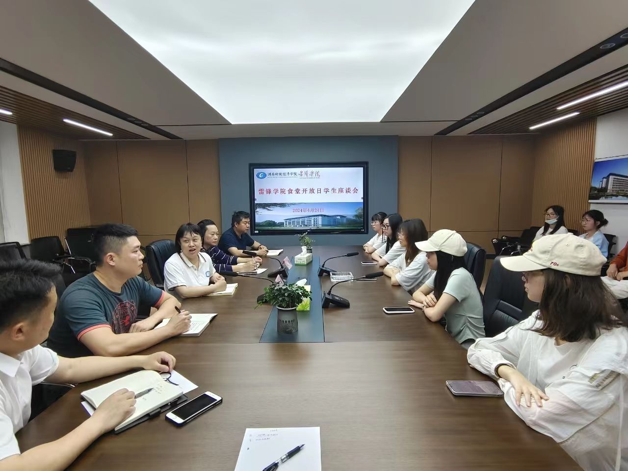 2024年4月24日下午雷锋学院举办了以“食堂开放日”为主题的学生座谈会。此次活动旨在增强学生与食堂管理部门之间的沟通,加强学生对食堂的食品安全监督,提升食堂服务质量,会上收集学生对食堂服务的意见和建议。