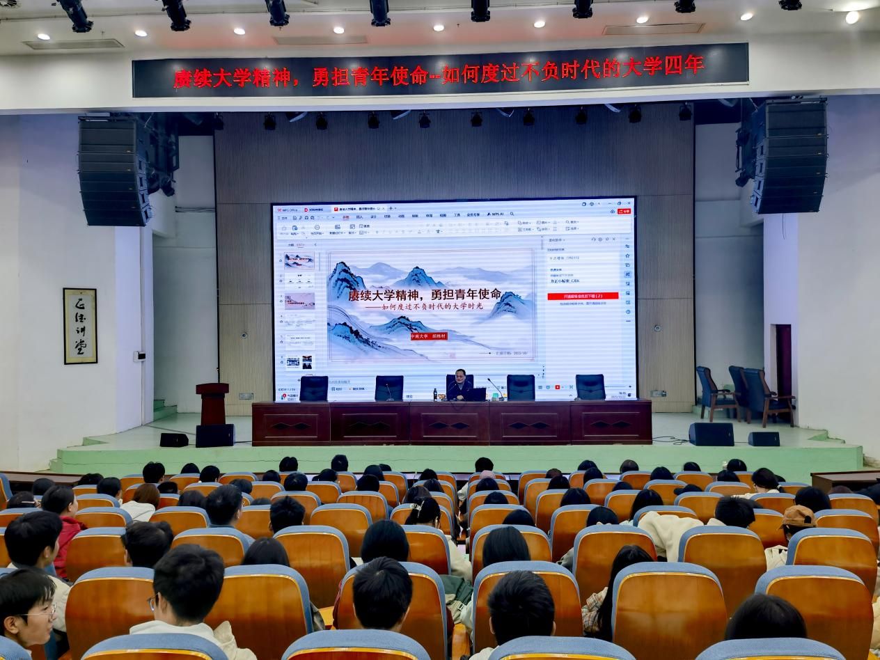 在阐释大学精神要义时,胡栋材强调了自由包容、追求真理、家国情怀与创新引领四大核心内涵。他以清华大学梅贻琦校长"大学者,非有大楼之谓也,乃有大师之谓也"的名言为引,结合西南联大的办学事迹,指出大学教育应注重人格塑造与独立思考能力的培养。同时,胡栋材结合大量个人经历,从青年时期的选择到工作时的见解,以真实案例激发学生们的奋斗热情。他通过引用总书记的寄语,指出新时代大学生传承大学精神,参与国家战略,建设人类未来的三个具体行动方向,鼓励当代青年“立大志,明大德,成大才,担大任”,奋勇当先,敢挑大任,不愧时代,不负韶华。最后,胡栋材寄语当代大学生应赓续大学精神,参与国家战略,建设人类未来,实现精神与使命紧密结合,方能不负大学四年时光。