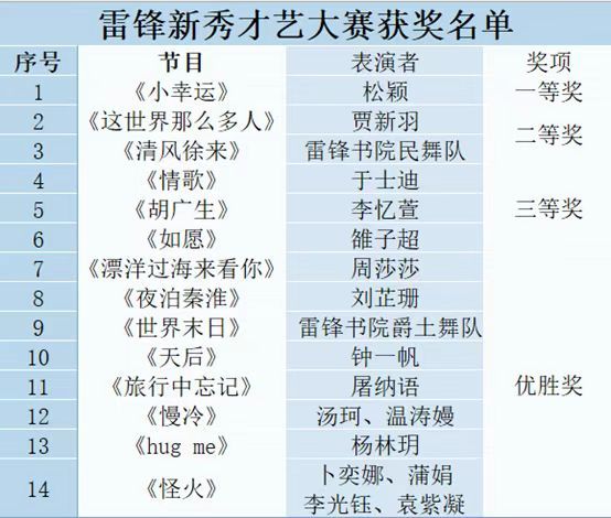 经过激烈的角逐,雷锋新秀才艺大赛的决赛结果已经揭晓。以下是本次比赛的获奖名单: