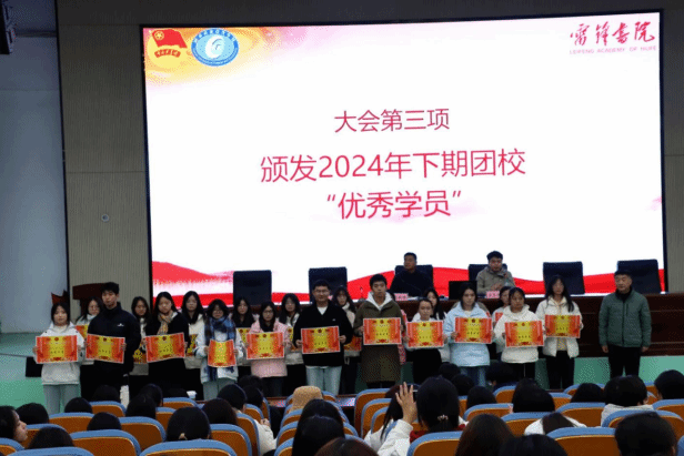 在全场热烈的掌声中,首先进行的是团校优秀干部的表彰,数位优秀干部依次走上领奖台,校领导为他们颁发荣誉奖状,并合影留念。这些优秀干部在团课学习期间表现出色,无论是理论学习还是实践活动,都展现出高度的积极性和卓越的领导力,因此被授予“优秀干部”称号。他们是全体学员学习的榜样。接下来进行的是团校优秀成员的表彰,优秀学员凭借在团课学习中的积极表现、深刻思考与出色实践,脱颖而出荣获“优秀学员”称号;他们在领奖台上展现出的青春风采与自信担当,成为全体学员学习的榜样。