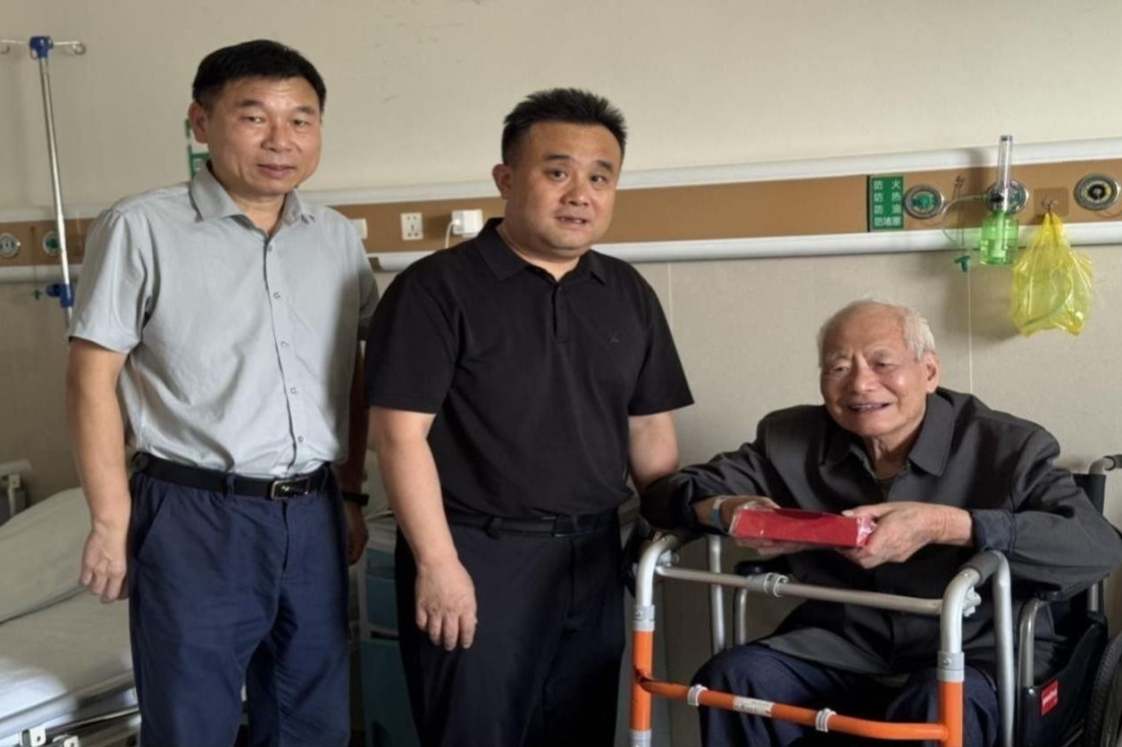 校党委委员、宣传统战部部长文炳勋(左)慰问老党员吴耀武(中) 肖萌/摄