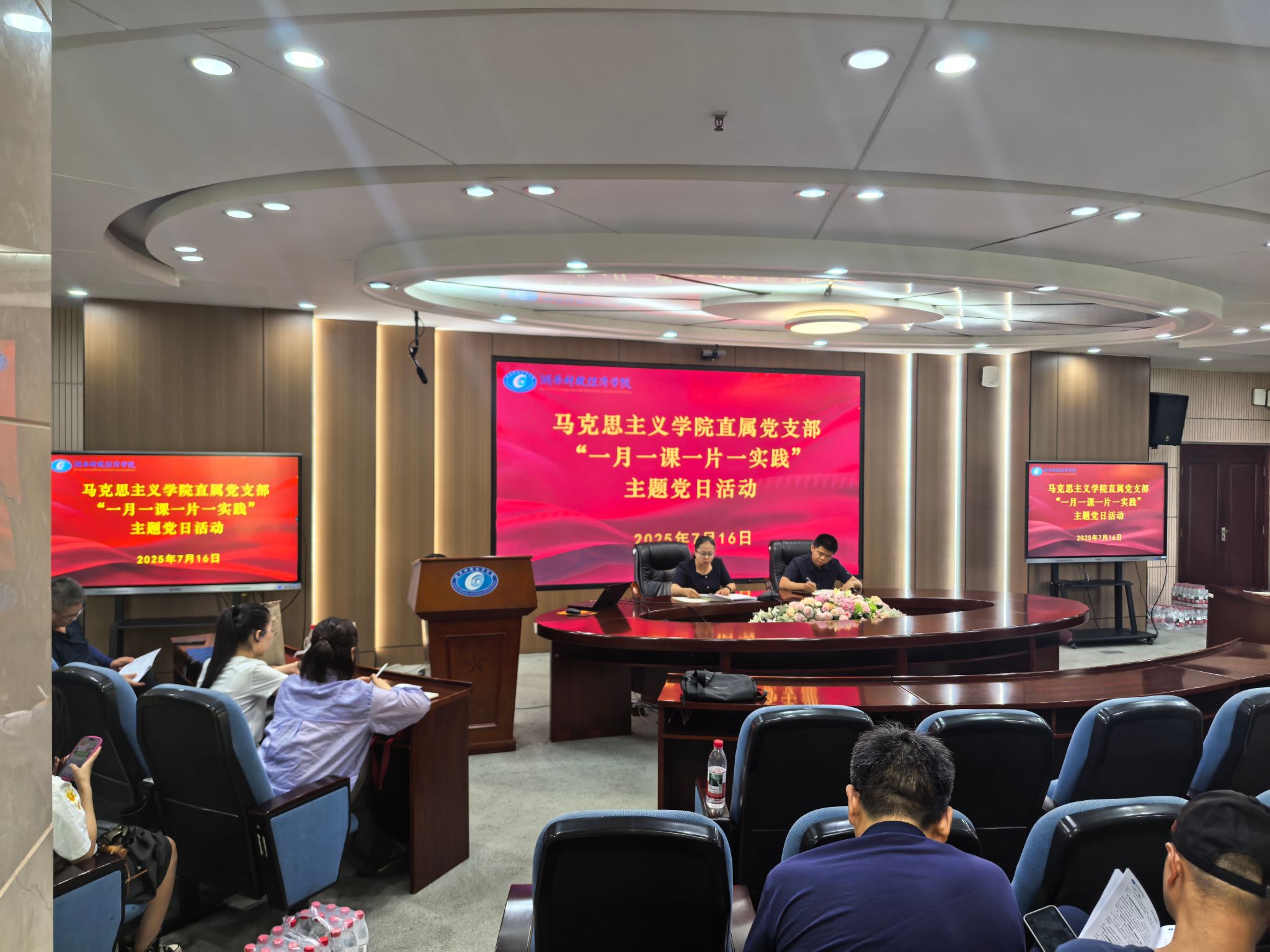 根据学校《关于开展2025年7月份“一月一课一片一实践”主题党日活动的工作提示》(湖财组通〔2025〕42号)精神,7月16日下午,马克思主义学院在办公楼五楼视频会议室开展“凝心聚力勇奋进,实干笃行促发展”主题党日活动。活动由直属党支部书记刘东艳主持,全体党员参加。