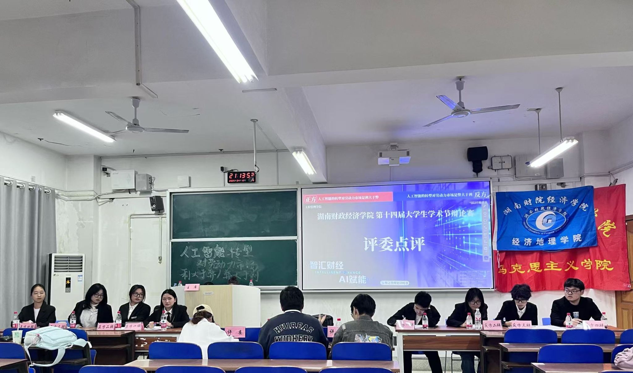 4月12日晚,马克思主义学院与经济地理学院联队(以下简称“马院经地联队”)与工程管理学院在三教学楼3402教室展开学术节辩论赛初赛交锋。双方围绕“人工智能转型对劳动力市场的利弊”这一时代性辩题,以跨学科视角展开激烈思辨。