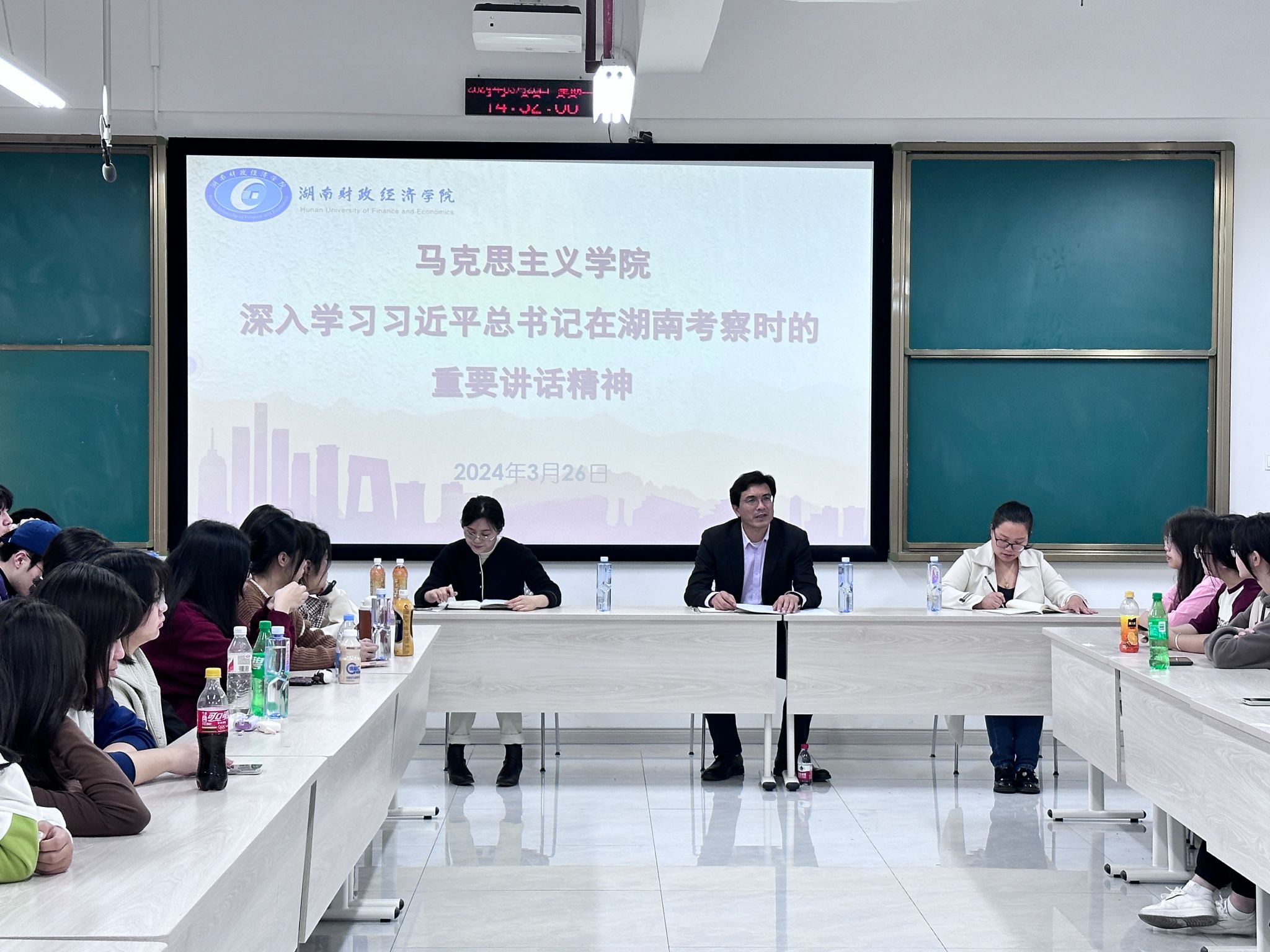 3月26日,马克思主义学院在雷锋校区L1512教室开展深入学习习近平总书记在湖南考察时的重要讲话和在新时代推动中部地区崛起座谈会上的重要讲话活动。学院直属党支部书记刘振强主讲,班主任阳海飞、辅导员汤雷以及2023级思想政治教育专业全体学生参加。会议由学工办主任周雄艳主持。