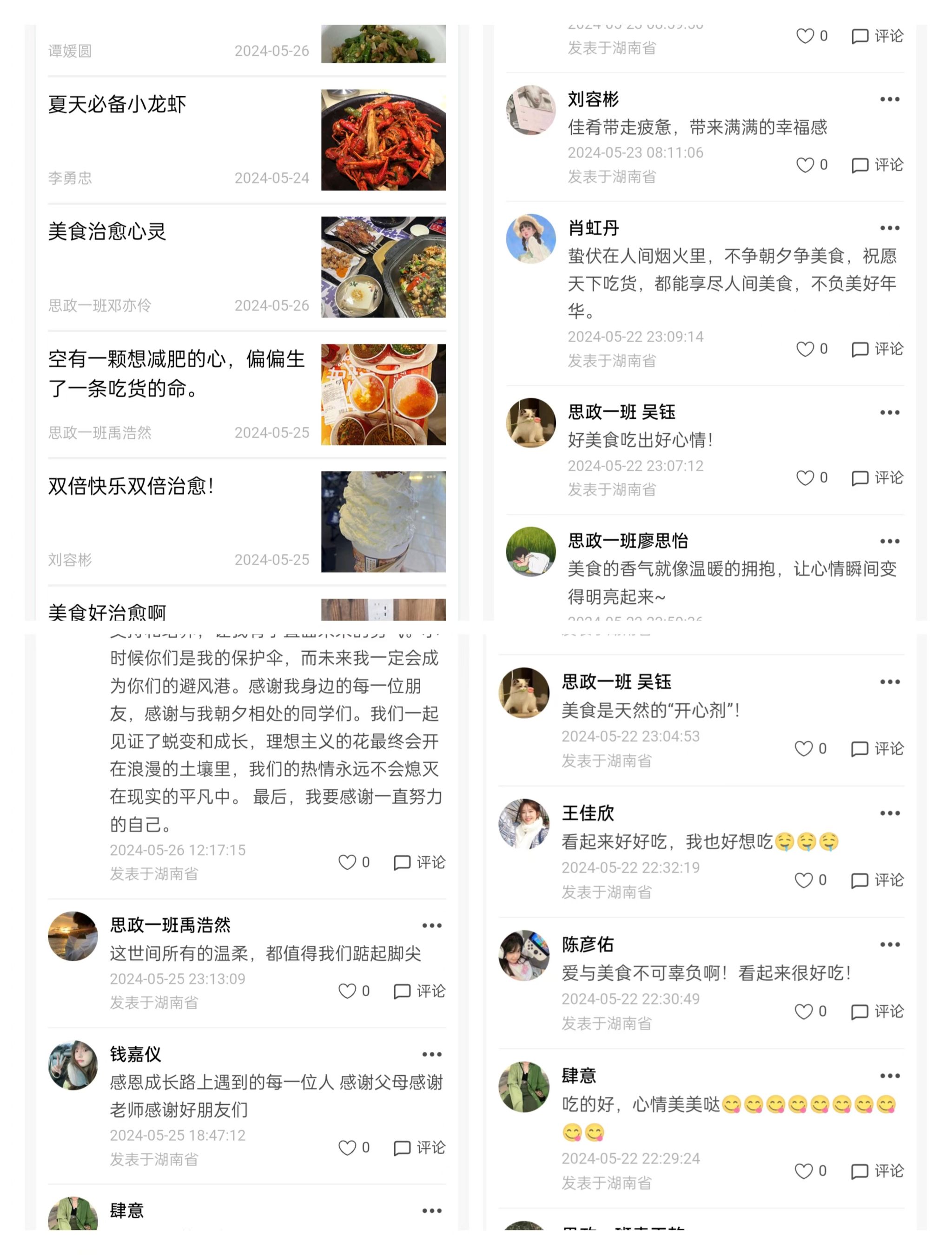 5月25日,“美食治愈分享日”线上活动圆满落幕。这场别出心裁的味蕾之旅,让同学们在易班平台上大展厨艺,与大家一同分享独特的美食体验。活动期间,辅导员周雄艳亲手制作的甜品为同学们带送去满满的甜蜜与温暖。同学们也纷纷上传各自精心准备的美食照片,从精致的点心到家常小菜,每一张都洋溢着对美食的热爱与创意,充分展示对美食的深厚热爱与无限创意,表达对治愈力量的独到见解与追求。