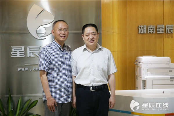 (肖湘愚(右)与星辰在线党委副书记、总编辑何旭(左)合影留念。)