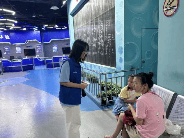 活动开展当日,志愿者们提前集结,统一身着蓝色志愿服,以饱满的热情与严谨的态度投入服务工作,在科技馆各功能区域有序开展专项服务。在迷宫体验区,志愿者们主动承担引导职责,于入口处耐心疏导游客有序入场,细致讲解体验规则与安全注意事项,帮助小朋友及游客消除顾虑,确保大家在探索过程中充分感受科技趣味;在高空项目区,志愿者们聚焦安全保障,协助游客规范穿戴安全装备,反复检查装备牢固性,同时实时维护现场秩序,及时疏导人流,保障每一位体验者在安全环境中享受项目乐趣;在 4D 影院区域,志愿者们细心协助观众佩戴观影设备,主动解答影片内容、播放时长等疑问,助力观众沉浸式感受科技与艺术融合的独特魅力;在 VR 体验区,志愿者们手把手指导小朋友操作设备,用通俗易懂的语言讲解设备原理,帮助孩子们在虚拟场景中开启奇妙的科技探索之旅。