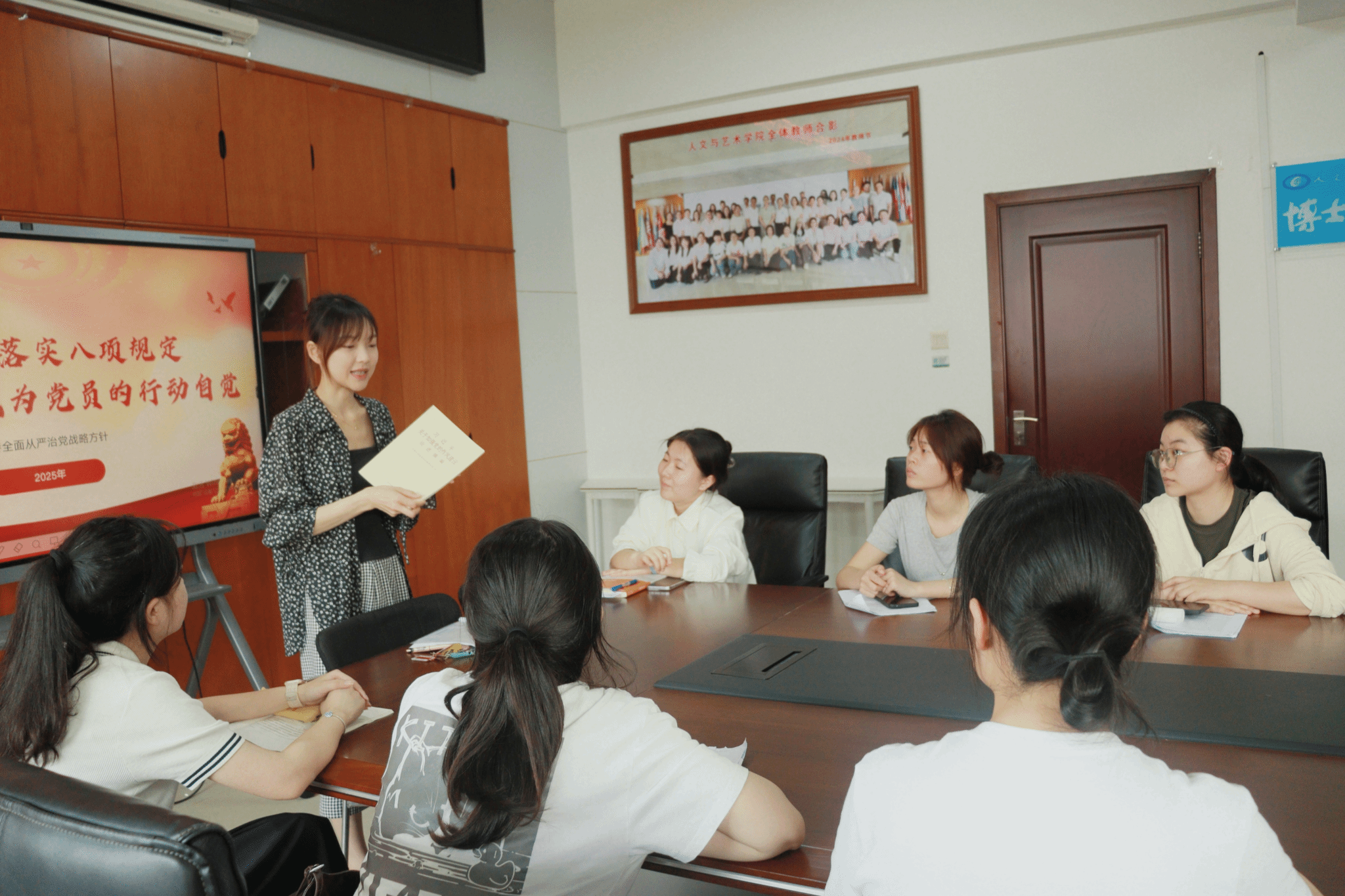 (本网讯)2025年4月23日,人文与艺术学院学生第一、第二党支部联合开展“学党纪·正作风·践初心”专题学习会,人文与艺术学院党委副书记杨艳、副院长毛璐璐与会指导,两支部全体党员同志参会,学生第二党支部书记欧璐主持会议,带领全体党员深入学习中共中央八项规定精神,推动作风建设走深走实。