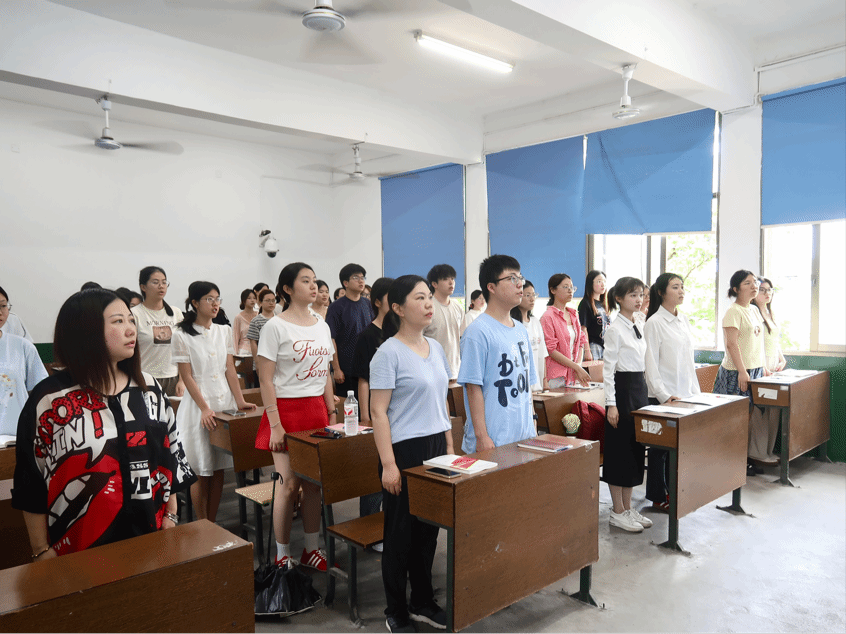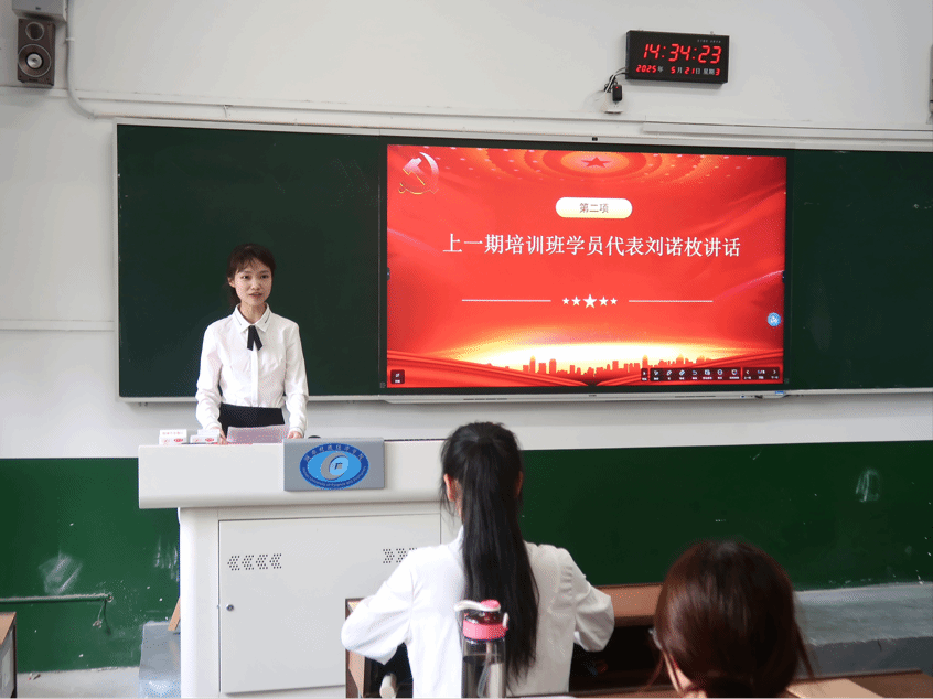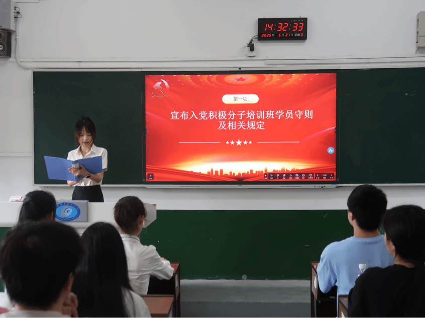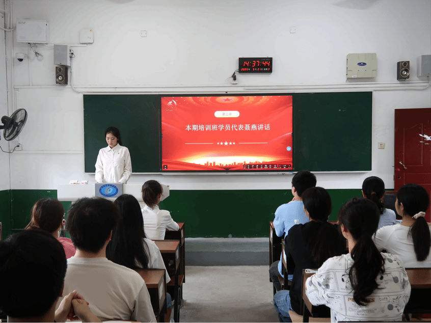 在雄壮的国歌声中,开班仪式正式启动。学生党支部书记欧璐首先宣读了入党积极分子培训班学员守则及相关规定,从理论学习、考核纪律等方面作出明确规定。随后,往届优秀学员代表刘诺枚结合自身成长经历,分享了"思想淬炼+实践历练"的双重收获;本期学员代表聂燕郑重表态,将以"理论入脑、信念入心、实践力行"的标准自我要求,展现了新时代青年的政治担当。分党校负责人杨艳在动员讲话中指出,全体学员做纪律严明的先锋,以高标准完成培训任务。其"学思用贯通,知信行统一"的殷切嘱托,为学员成长锚定了坐标。