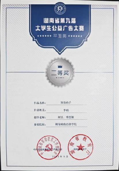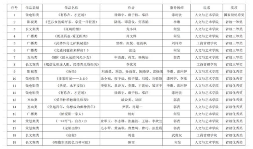 荣获全国大学生广告艺术大赛国奖省奖40余项;获得湖南省大学生公益广告大赛省级奖项多项;获得大学生艺术展演湖南省一等奖;获得湖南省青年文化艺术节省级金奖;获得中国大学生广告艺术节学院奖国家级奖项8项;获得湖南微电影大赛省级奖项14项;获得湖南省高校“青春学习堂”短视频大赛特等奖等省级奖项11项,成功实现大满贯!