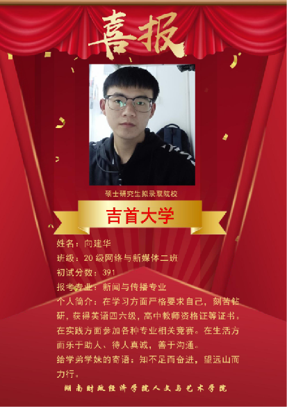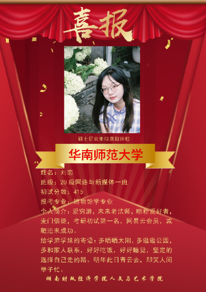 近几年,本校网络与新媒体专业考研成绩突出,多名网媒学子在激烈的“考研”大战中脱颖而出,成功上岸湖南大学、暨南大学、湖南师范大学、合肥工业大学、浙江传媒学院、首都师范大学等多所著名高校的新闻与传播专业,发挥网络与新媒体专业知识的优势,继续在他们所热爱的领域深造。