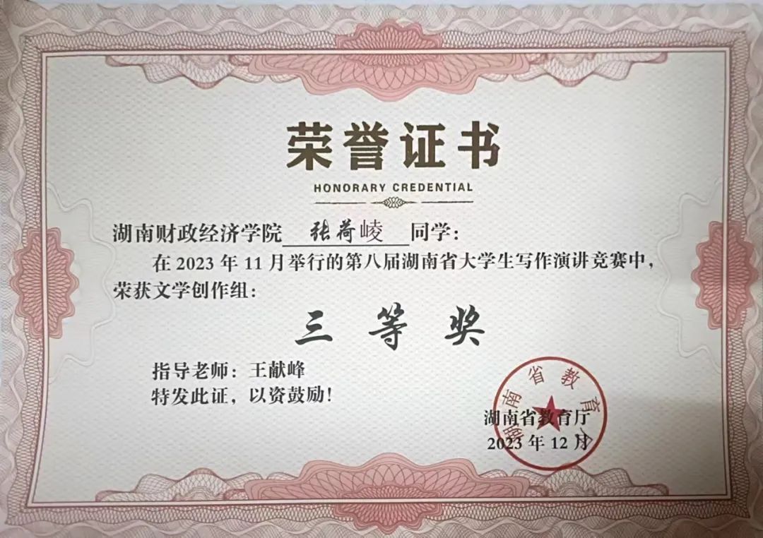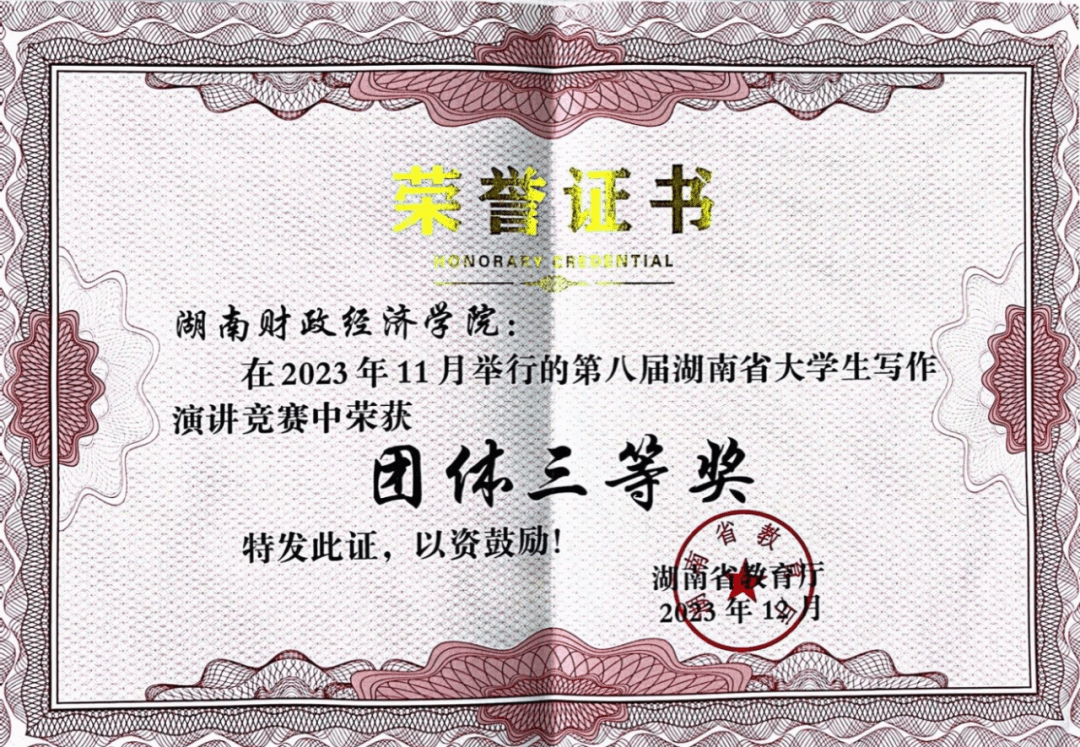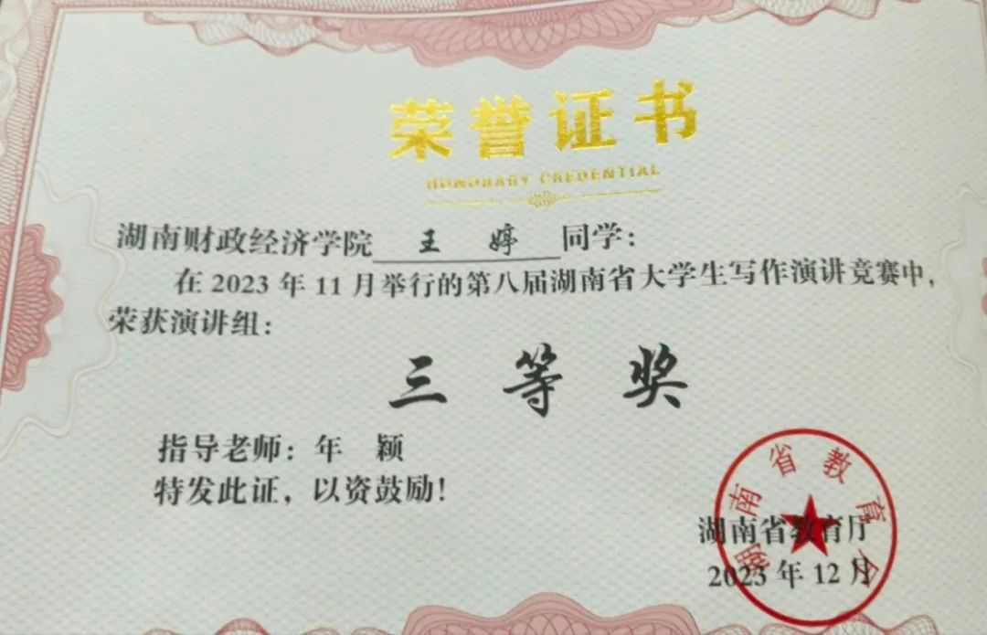 湖南省大学生写作演讲竞赛获奖证书