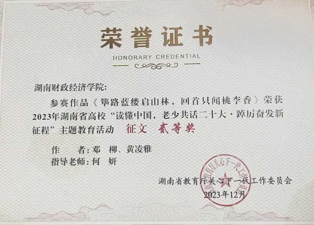 专业学生获湖南省高校主题教育活动征文二等奖