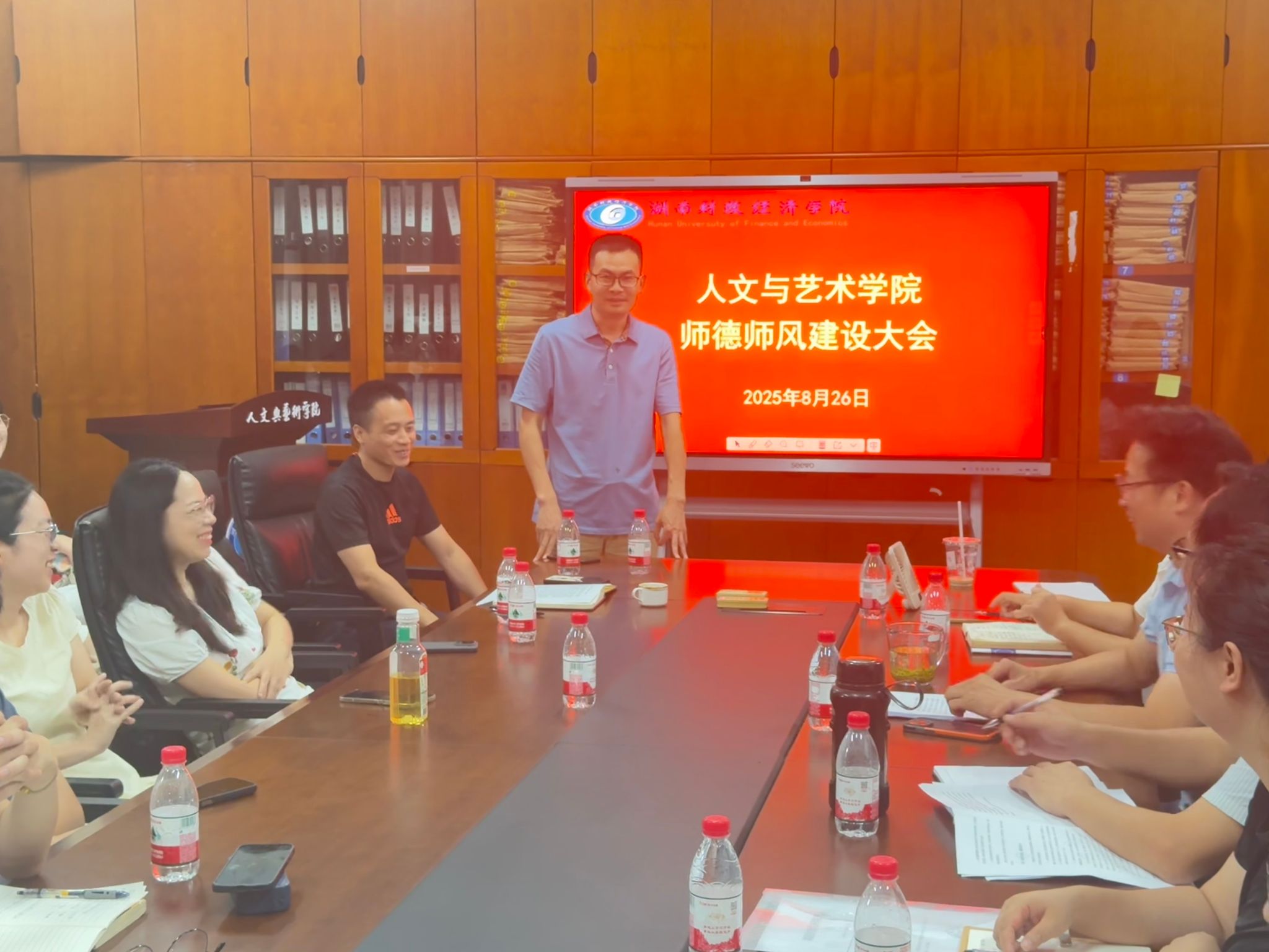 (本网讯)为发挥榜样示范引领作用,推动师德师风建设走深走实。8月26日,人文与艺术学院在817会议室召开师德师风建设专题大会,学院领导班子、全体教职工参加。会议由院党委书记葛干忠主持。会议现场会议开始,葛干忠带领全体教师重温了《新时代高校教师职业行为十项准则》,结合典型案例剖析了当前师德师风建设中需警惕的问题,要求全体教师以“学高为师、身正为范”为准则,将师德要求融入教学、科研与育人各环节。王亚辉博士发言会议邀请师德师风考核优秀教师代表、...