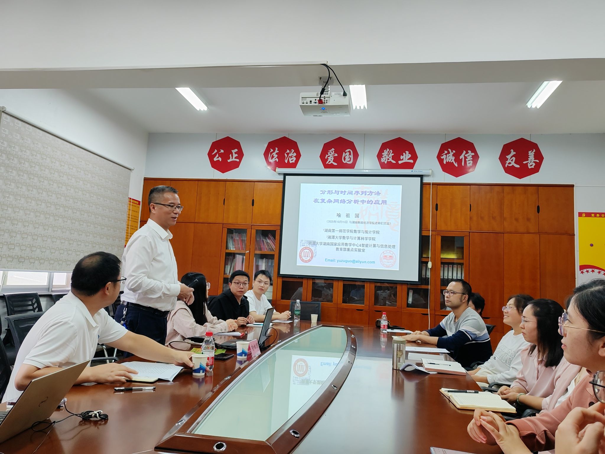 10月15日下午, 湖南第一师范学院喻祖国教授应邀在办公楼809会议室做了一场十分精彩的学术报告。学院领导班子、年青博士参加。此次报告的主题是《分形与时间序列方法在复杂网络分析中的某些应用》,报告会由学院院长尹向飞主持。
