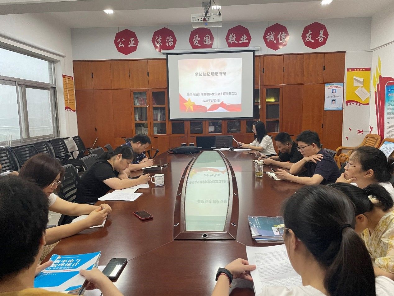 2024年6月24日上午,数学与统计学院教师党支部于办公楼809会议室开展“学纪、知纪、明纪、守纪”主题党日活动。活动由支部书记丁德琼主持,学院全体教工党员参加。