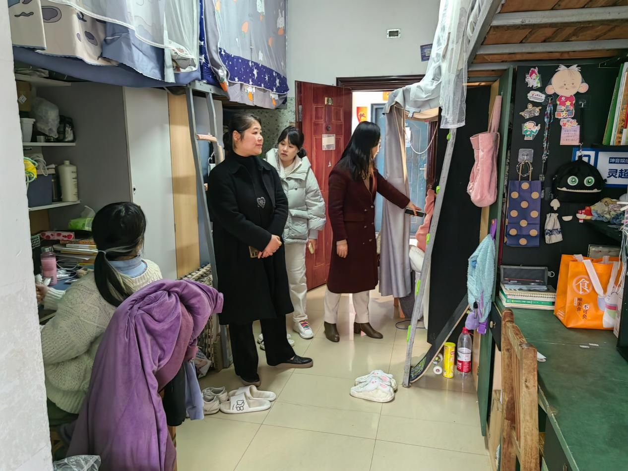 在走访宿舍过程中,王萱一行深入学生宿舍各楼层,对每间宿舍和角落进行了卫生、消防设施、用电安全等方面的安全隐患排查。重点对学生宿舍内的违章电器、乱拉电线等现象进行了严厉查处和批评整改,提醒同学们严格遵守学校安全管理等规定,共同维护好宿舍安全与卫生。