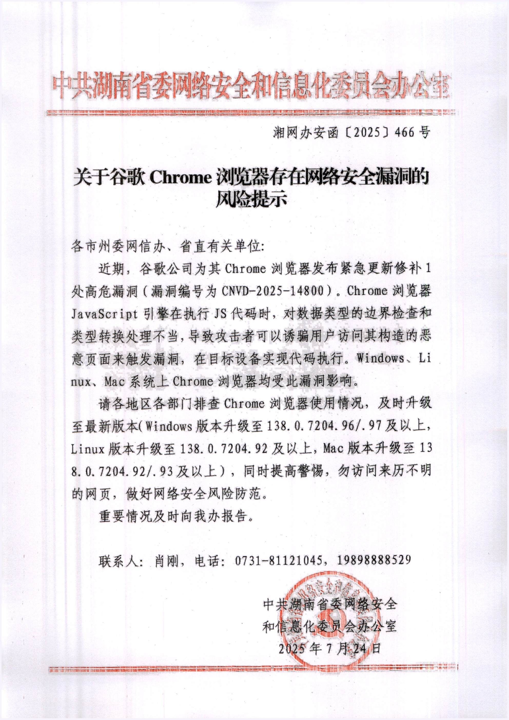 接中共湖南省委网络安全和信息化委员会办公室通知(湘网办安函〔2025〕466号)(详见文件所述),谷歌 Chrome 浏览器近期曝出一处高危漏洞(编号:CNVD-2025-14800)。该漏洞涉及 JavaScript 引擎对数据类型处理的缺陷,攻击者可通过构造恶意网页诱导用户访问,从而在目标设备上执行任意代码,威胁系统安全。