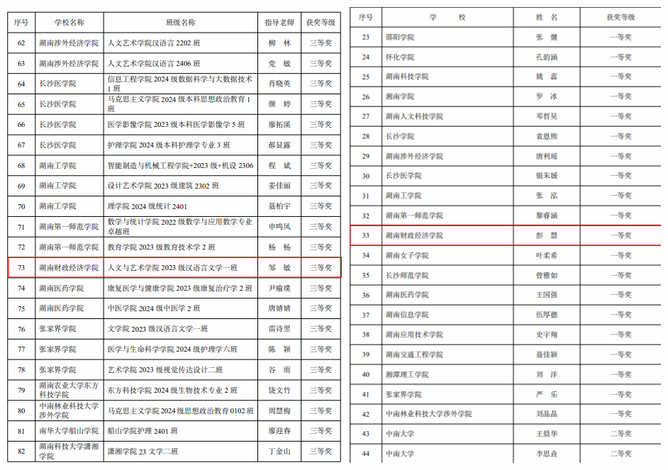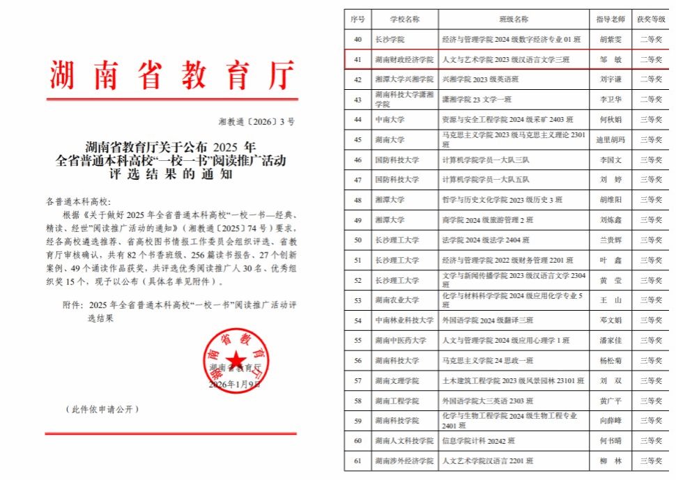 分别由邹敏老师指导的人文与艺术学院2023级汉语言文学三班荣获“书香班级奖”二等奖、2023级汉语言文学一班荣获“书香班级奖”三等奖;工程管理学院彭慧同学荣获“优秀读书报告奖”一等奖、人文与艺术学院陈欣、法学与公共管理学院李烨同学荣获“优秀读书报告奖”二等奖、财政金融学院陈锦瑞、会计学院骆娟、会计学院刘慧钰同学荣获“优秀读书报告奖”三等奖;财政金融学院易好老师荣获“优秀阅读推广人”。