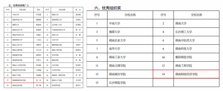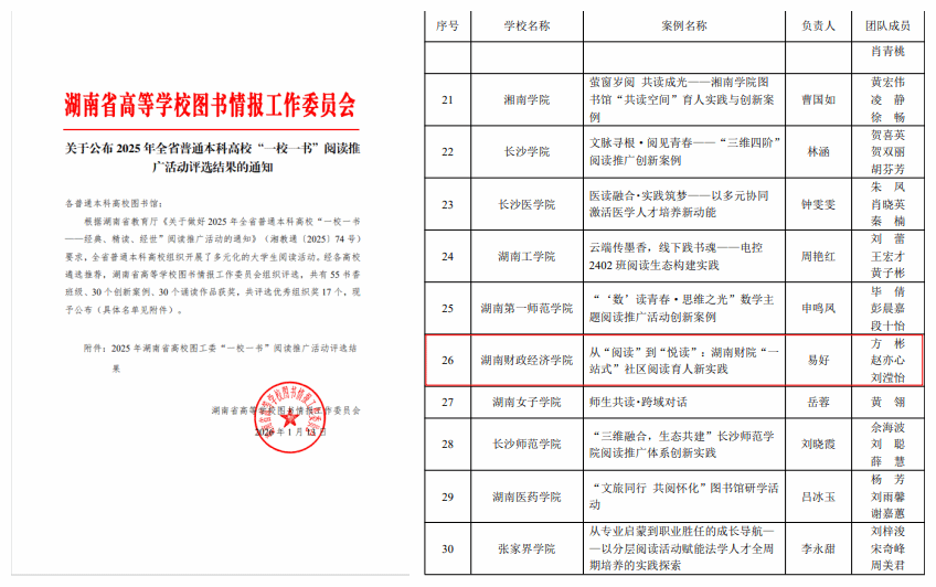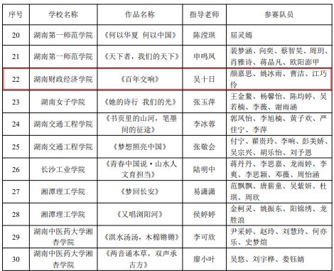 此外,财政金融学院提交的案例《从“阅读”到“悦读”:湖南财院“一站式”社区阅读育人新实践》荣获省高校图工委“创新案例奖”;由吴十日老师指导的诵读作品《百年交响》荣获诵读比赛奖。