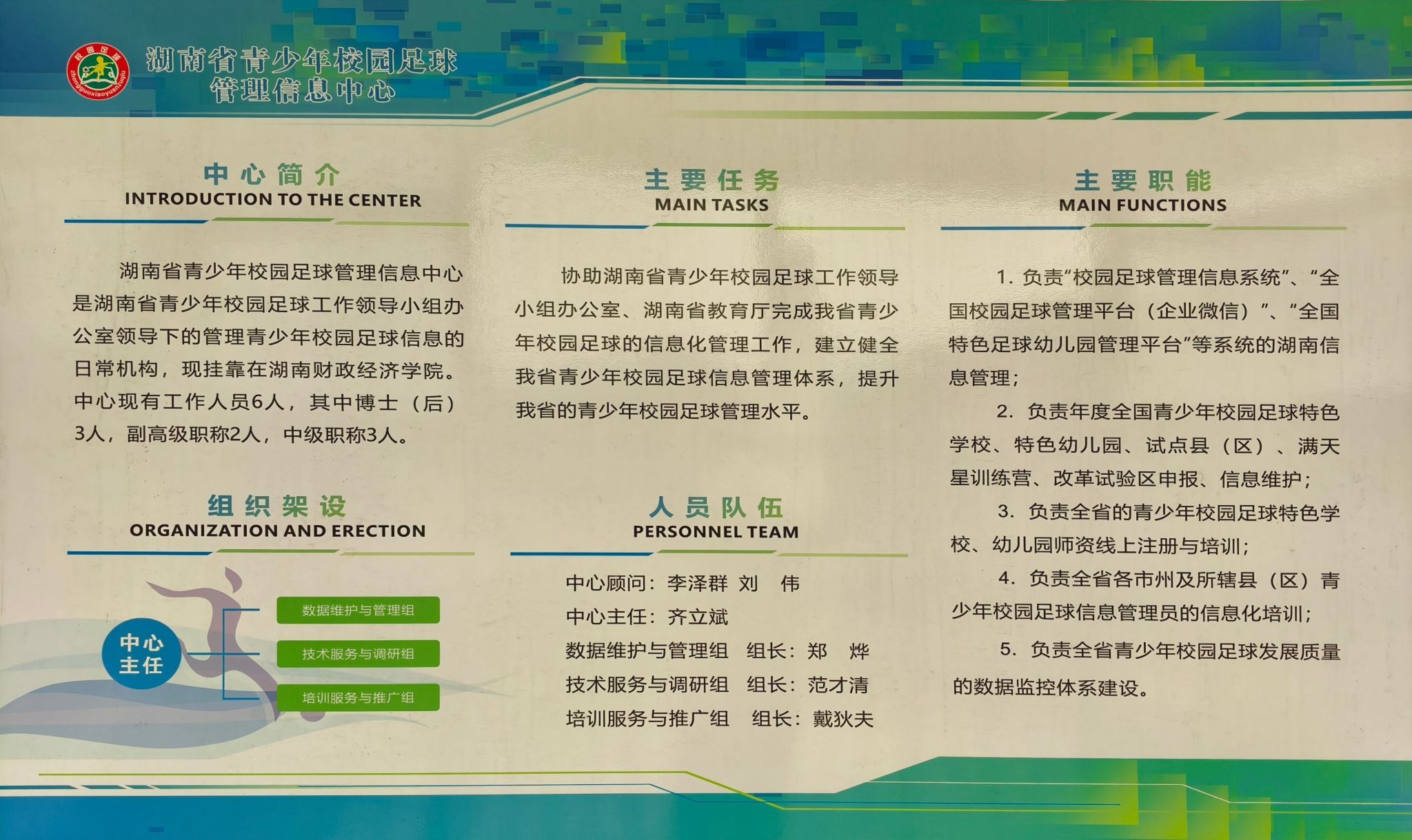 协助湖南省青少年校园足球工作领导小组办公室、湖南省教育厅完成我省青少年校园足球的信息化管理工作,建立健全我省青少年校园足球信息管理体系,提升我省的青少年校园足球管理水平。