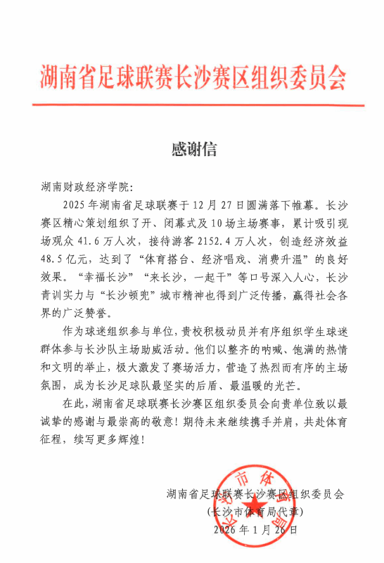 (本网讯)1月26日,beat365官网收到一封来自湖南省足球联赛长沙赛区组织委员会的感谢信,对beat365官网在2025年湖南省足球联赛期间,积极动员组织学生球迷群体参与赛事助威活动所做出的突出贡献表示诚挚感谢与崇高敬意。