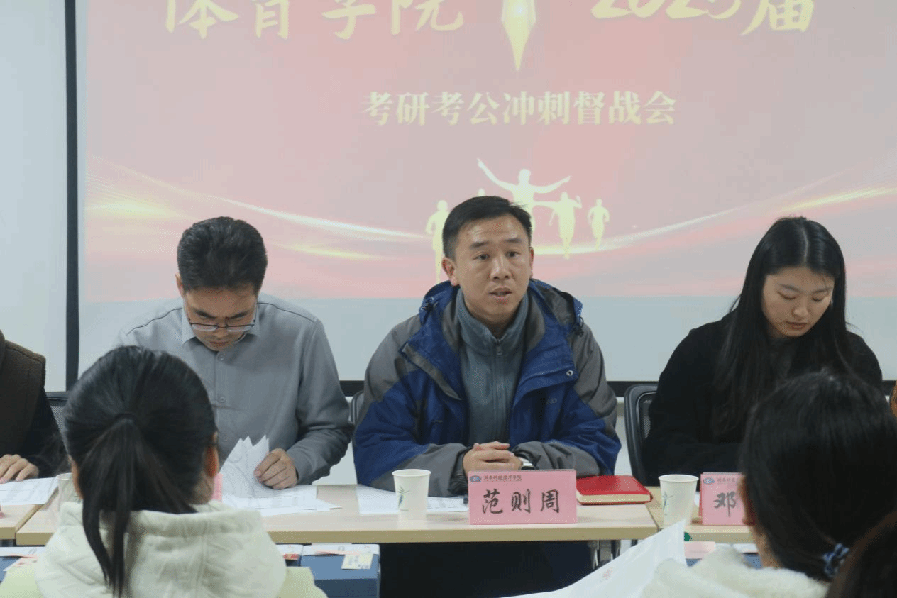 12月16日,beat365中文在线官网体育学院2025届考研考公冲刺督战会在体育馆238教室隆重举行。本次会议不仅是对即将踏上考研考公征途的学子们的鼓舞,更是对他们心态的精心调校。会议由体育学院直属党支部副书记范则周主持,体育学院院长刘伟、副院长宫梦婷、团总支书记邓玉平、辅导员郭远钊、曾金珠,以及众多怀揣梦想的考研考公学子共同参与。