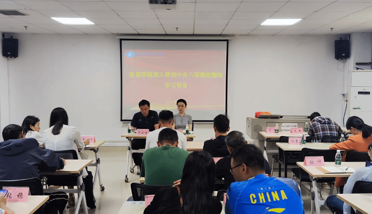 (本网讯)4月9日下午,体育学院在体育馆238会议室召开全体教职工大会,专题学习中央八项规定精神。会议由直属党支部副书记范则周主持,学院全体教职工参与。会议聚焦深化作风建设,强化纪律意识,以高质量党建引领学院事业发展,围绕理论学习、问题查摆、制度完善等环节展开。