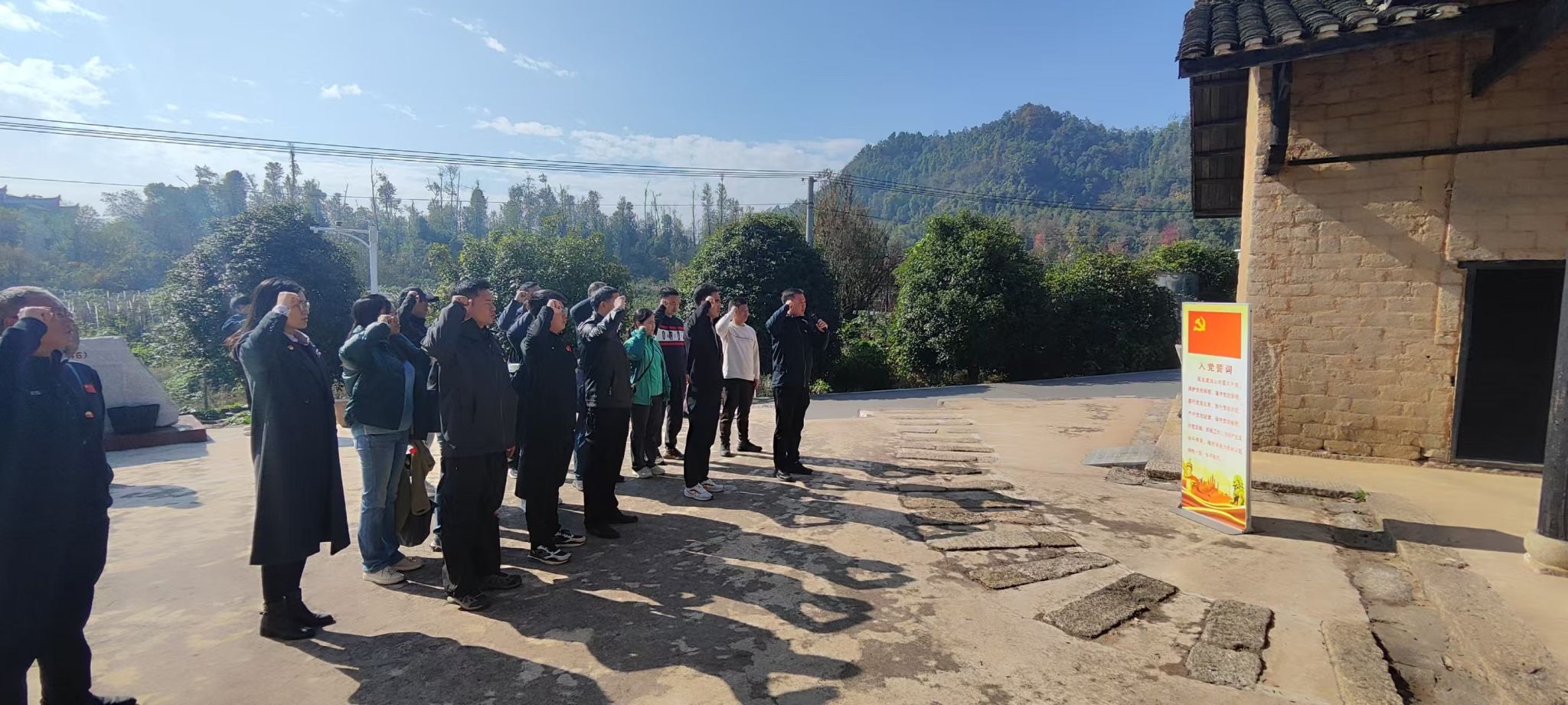 随后,大家前往中共湖南省委旧址参观。在白色恐怖笼罩的1930年代,省委机关在此险峻环境中领导工农运动、配合红军作战,坚韧不拔的革命意志深深触动了在场的每一个人。在庄严肃穆的省委旧址前,面对鲜艳的中国共产党党旗,由支部书记范则周同志领誓,全体党员紧握右拳,重温入党誓词。铿锵有力的誓言在山谷间回荡,表达了大家不忘初心、牢记使命,为党的事业奋斗终生的坚定决心。