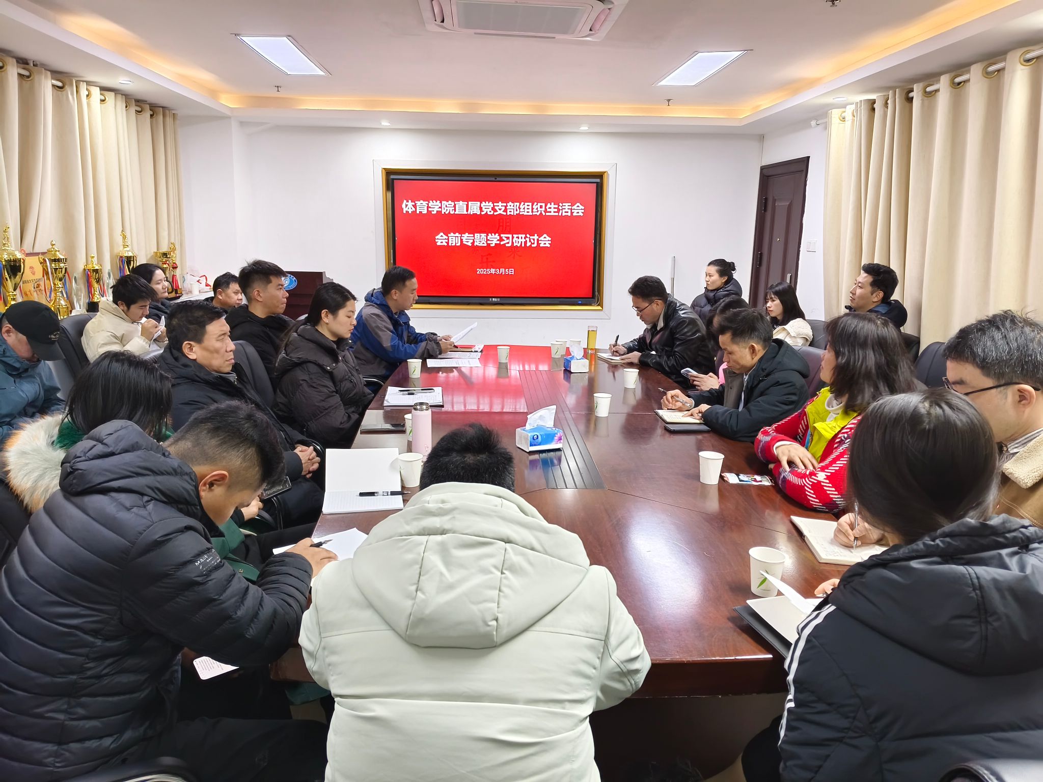 3月5日下午,体育学院直属党支部在体育馆237会议室召开2024年度组织生活会会前专题学习研讨会。会议由直属党支部副书记范则周主持,全体教师党员参会,为年度组织生活会筑牢思想根基。