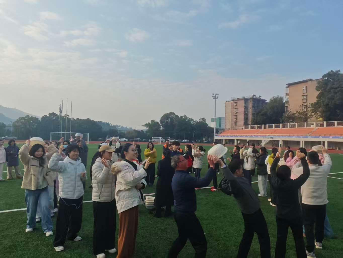 9 时 15 分,热身环节正式开启。体育学院直属党支部精心选派的志愿者教练闪亮登场,他们凭借专业的知识和技能,引领全员进行了节奏欢快的热身操。从颈、肩、腕到髋、膝、踝等各个关节的激活,再到弓步压腿等动态拉伸动作,每一个动作都精准到位、规范标准。配合着动感十足的音乐,现场气氛迅速被点燃,大家热情高涨,为即将开始的接力跑做好充分准备。